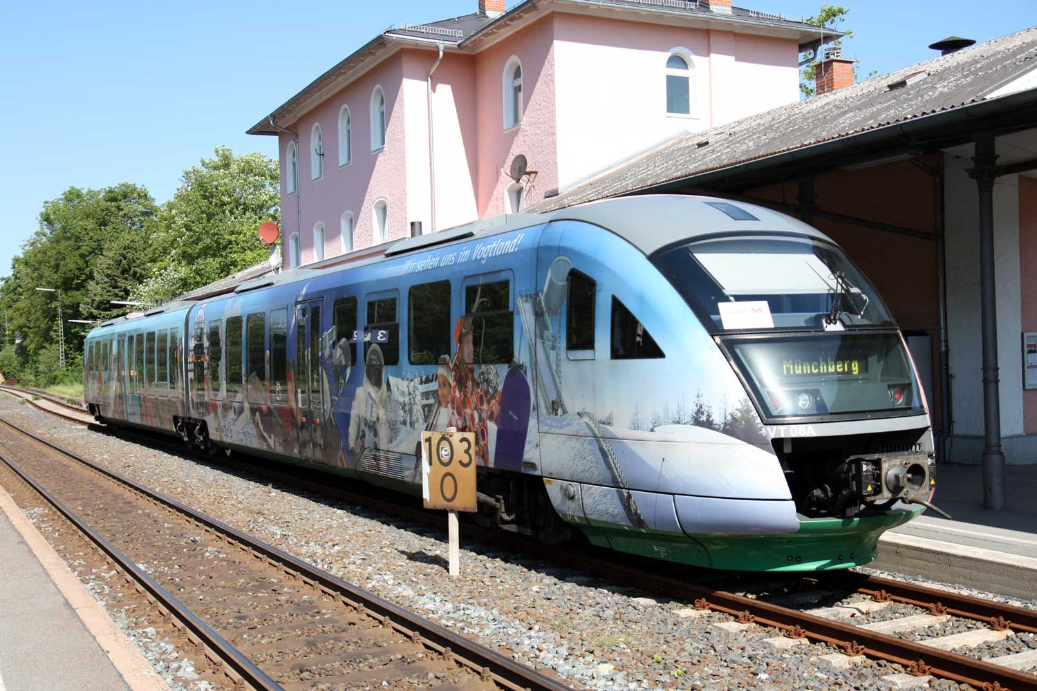 | Münchberg | 102,97 | km 0,0 der Strecke Münchberg 0,0 - Helmbrechts 9,31 (= km 10,58 - Schauenstein 4,91 - Streckenunterbrechung - Selbitz 0,0 ) |