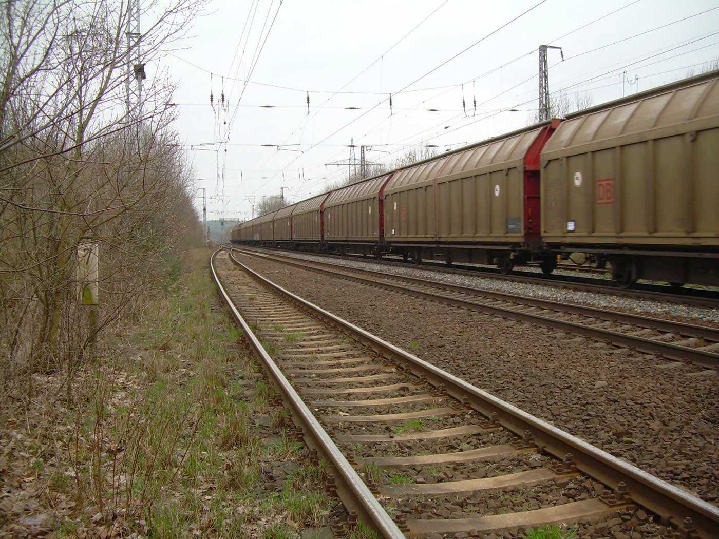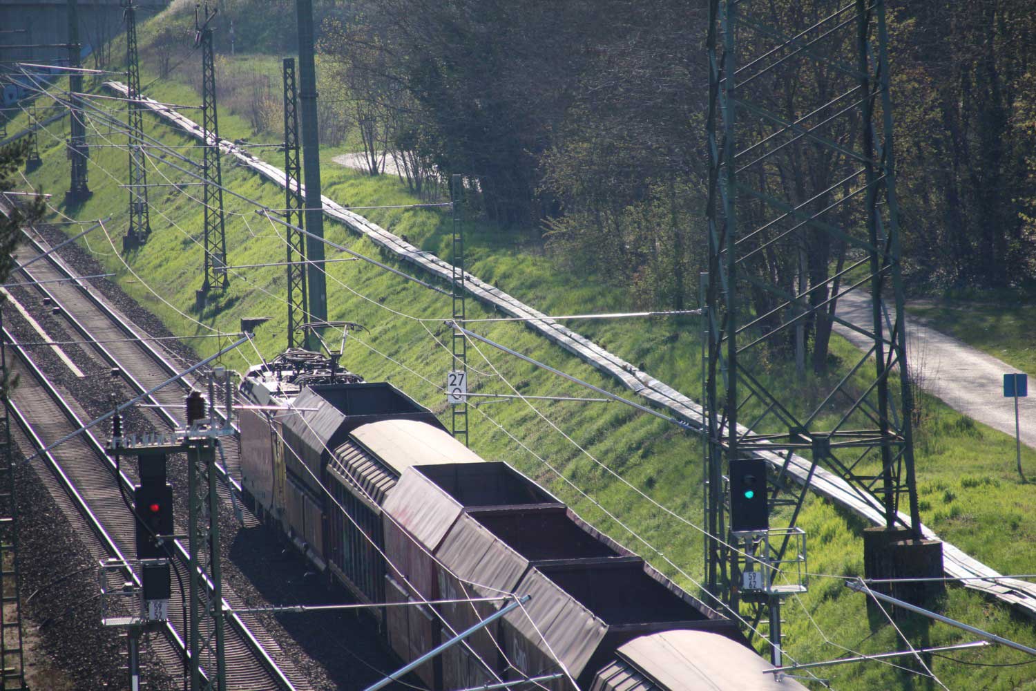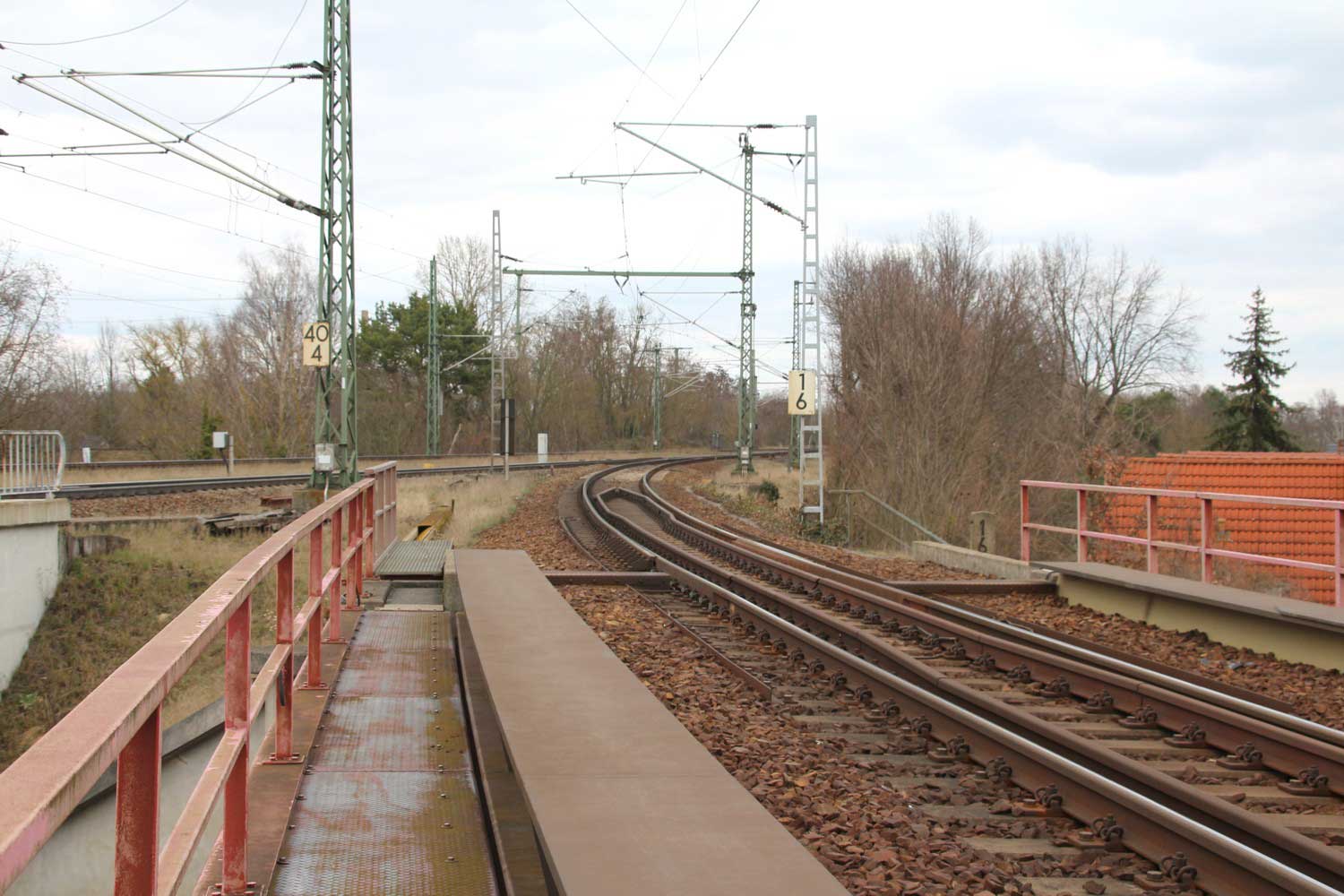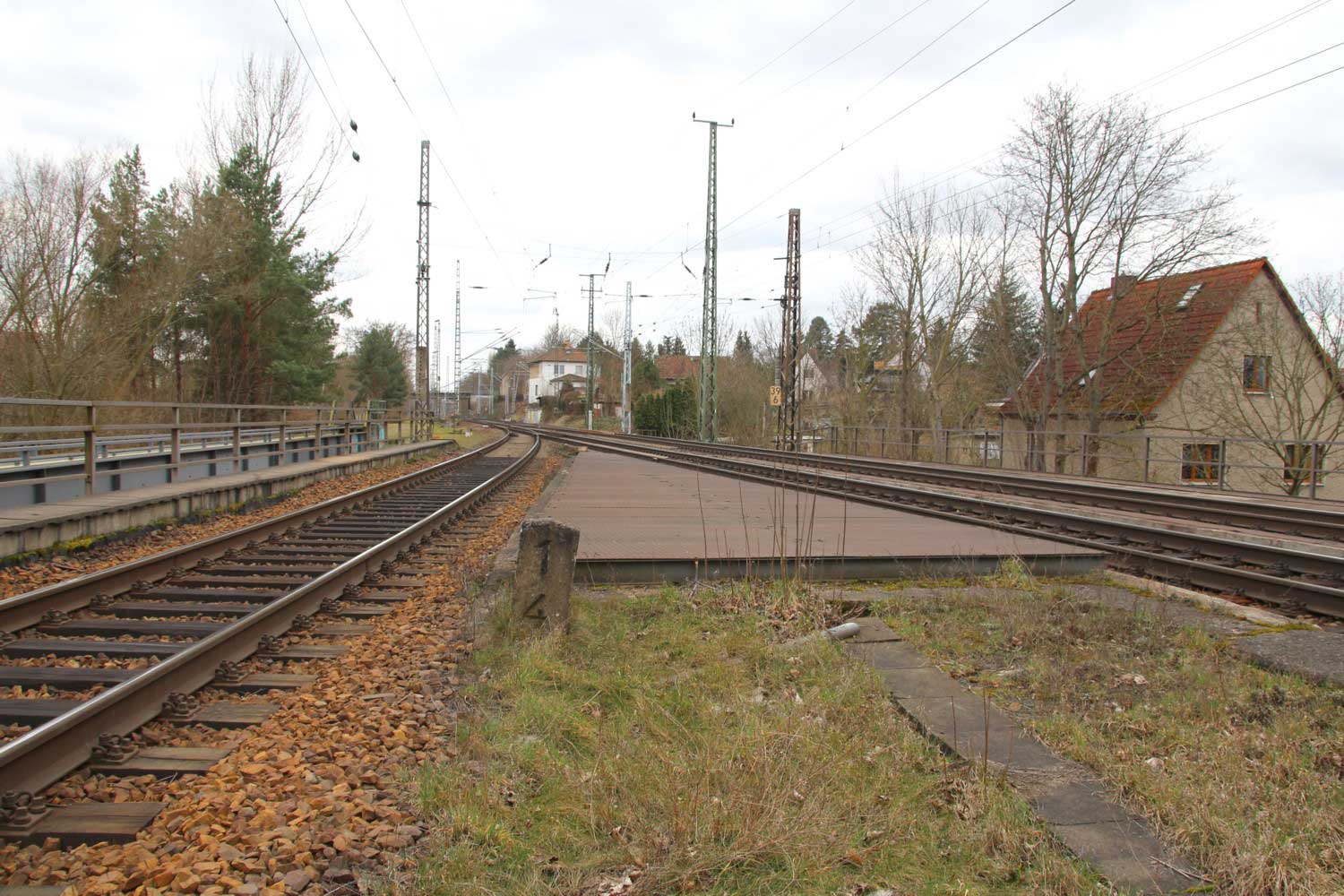 Halb rechts ankommend das Gegenrichtungsgleis (lange Kurve) der Strecke