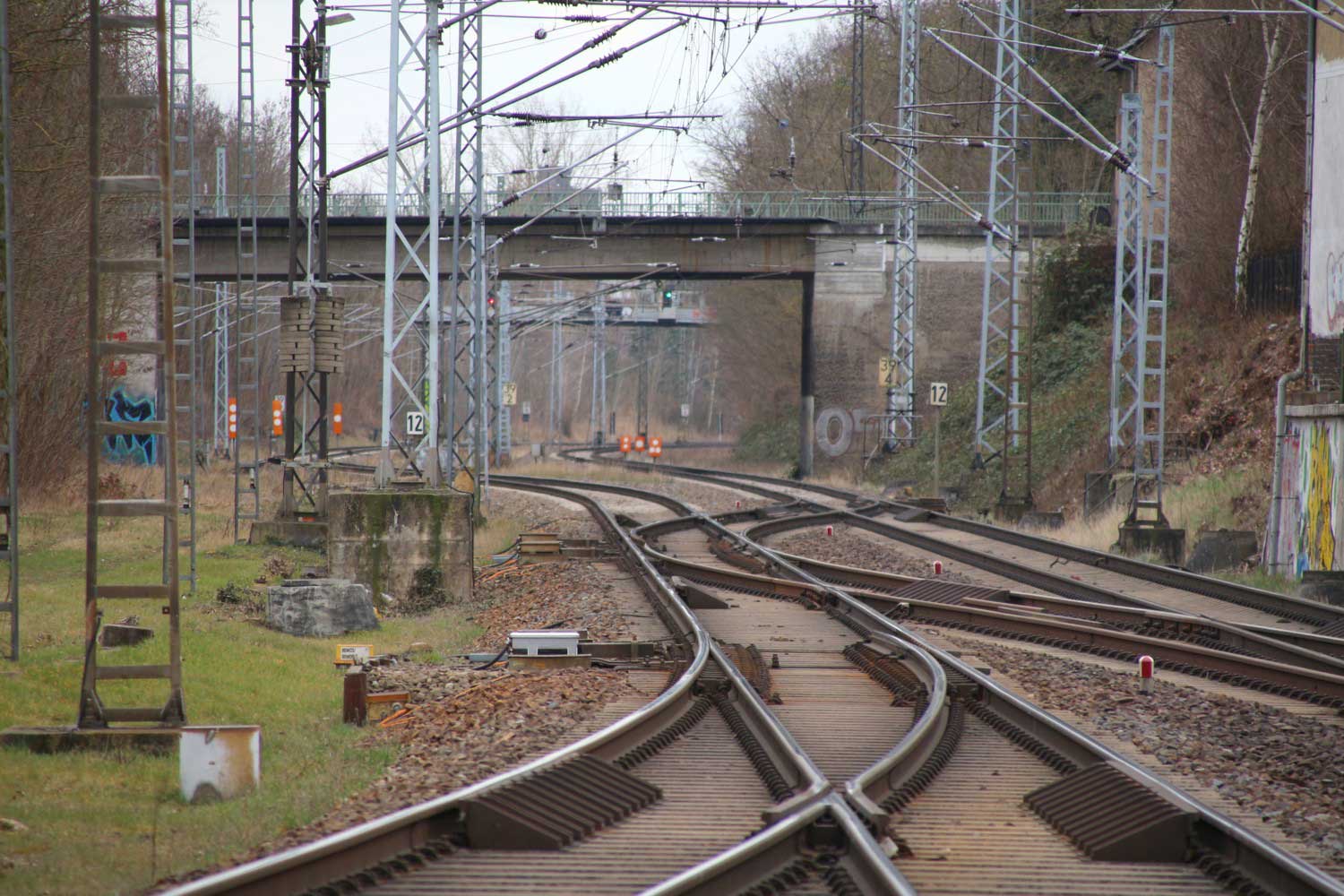 Ganz links ankommend das Richtungsgleis (kurze Kurve) der Strecke
