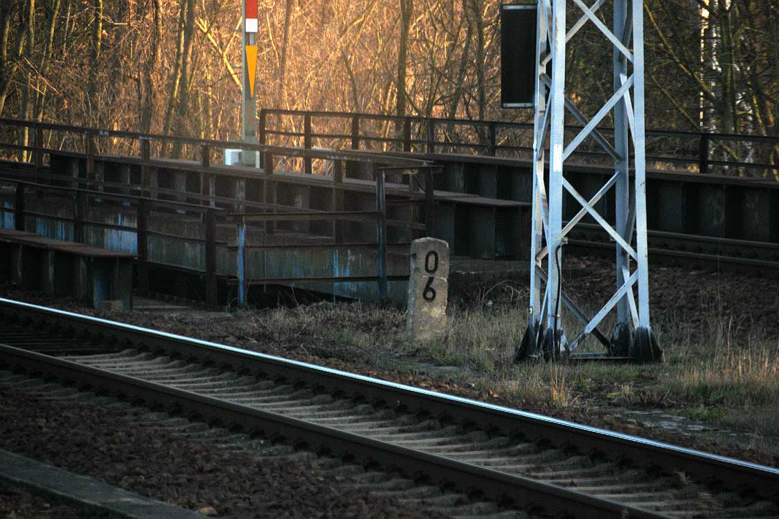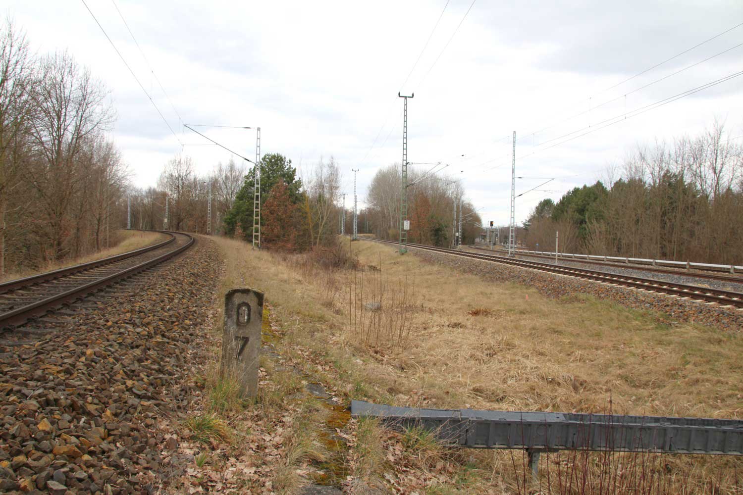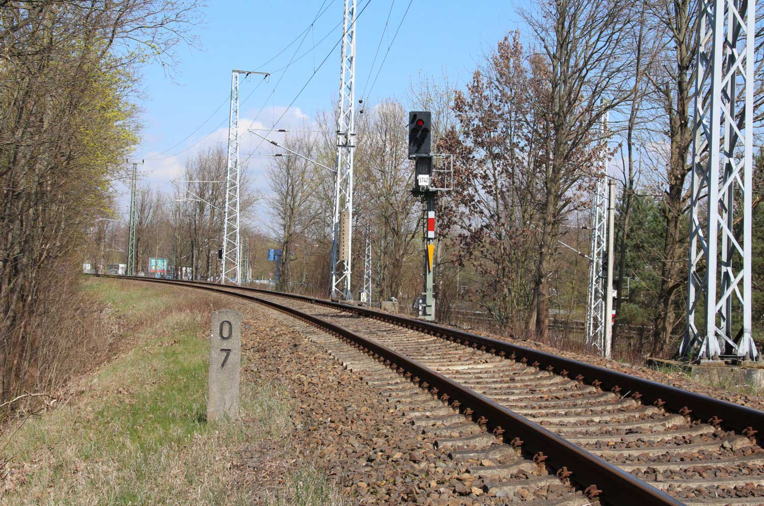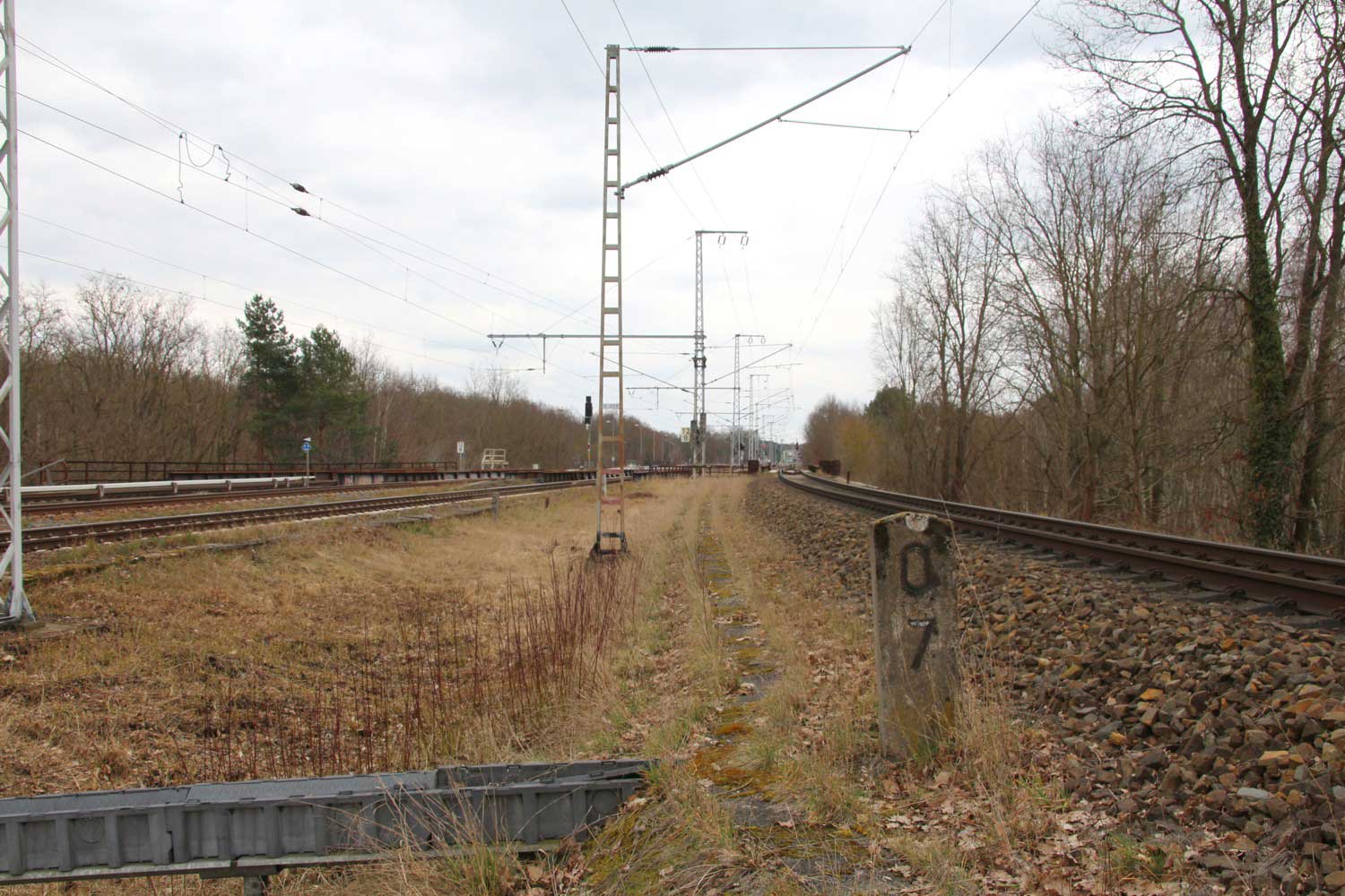 km 0,6 (Tafel) und km 0,7 (Stein) zwischen Berlin-Grünau und Abzw Grünauer Kreuz