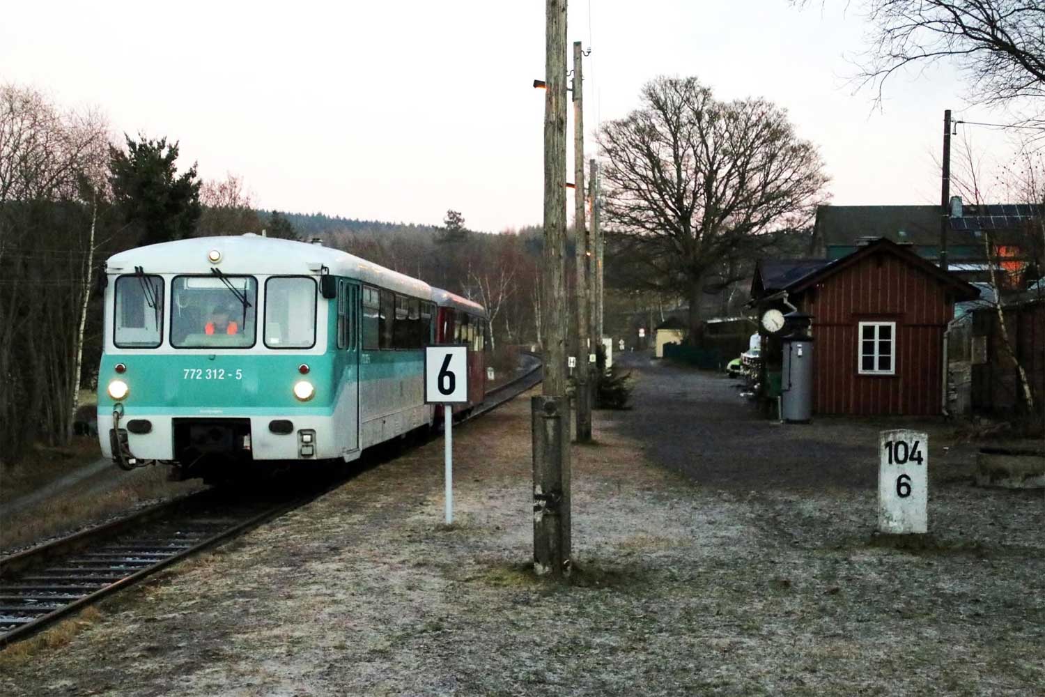 | Zwotental | 101,568 | km -0,42 der Strecke Zwotental 0,0 - Klingenthal 8,234 - Grenze Deutschland/Tschechoslowakei 8,770 = {km 27,452 - Sokolov [früher: Falkenau (Eger)] 0,0 } (ZK) |