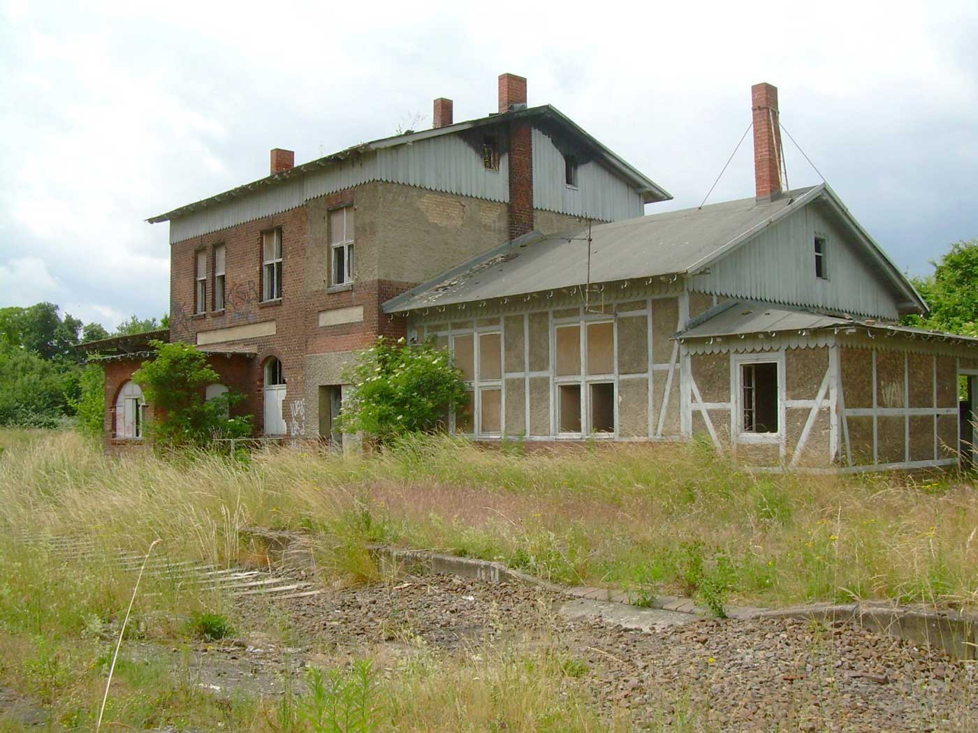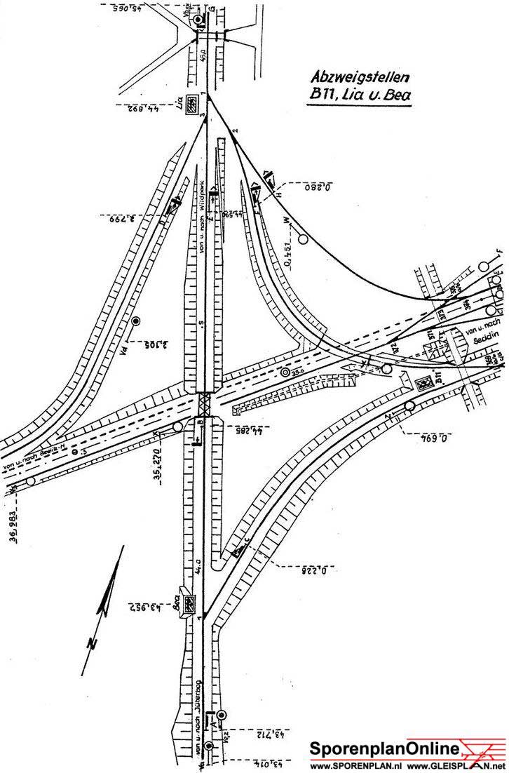 | km 38,0 der Strecke Dahme (Mark) 0,0 - Hohenseefeld 10,872 - Jüterbog 38,0 mit Zweigstrecke [Dahme (Mark) 0,0] - Hohenseefeld 10,872 - Jänickendorf 38,76 - Luckenwalde Süd 44,9 (Jüterbog-Luckenwalder Kreiskleinbahnen) Spurweite 750 mm | ||