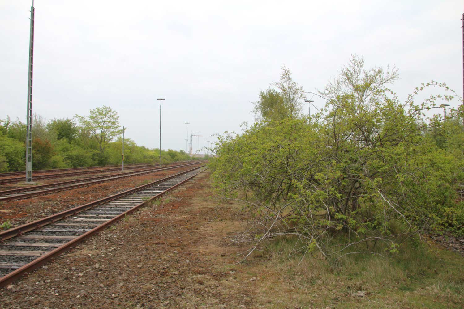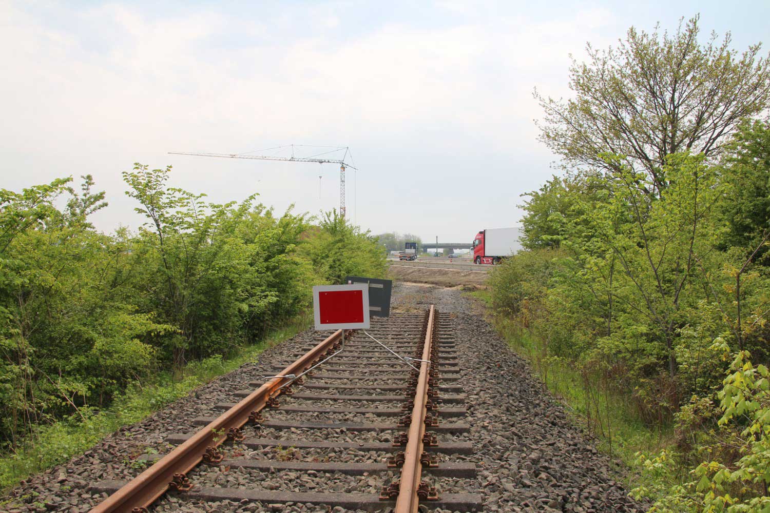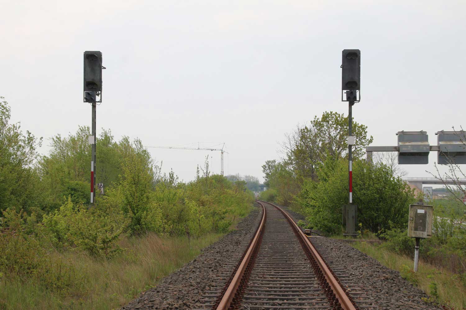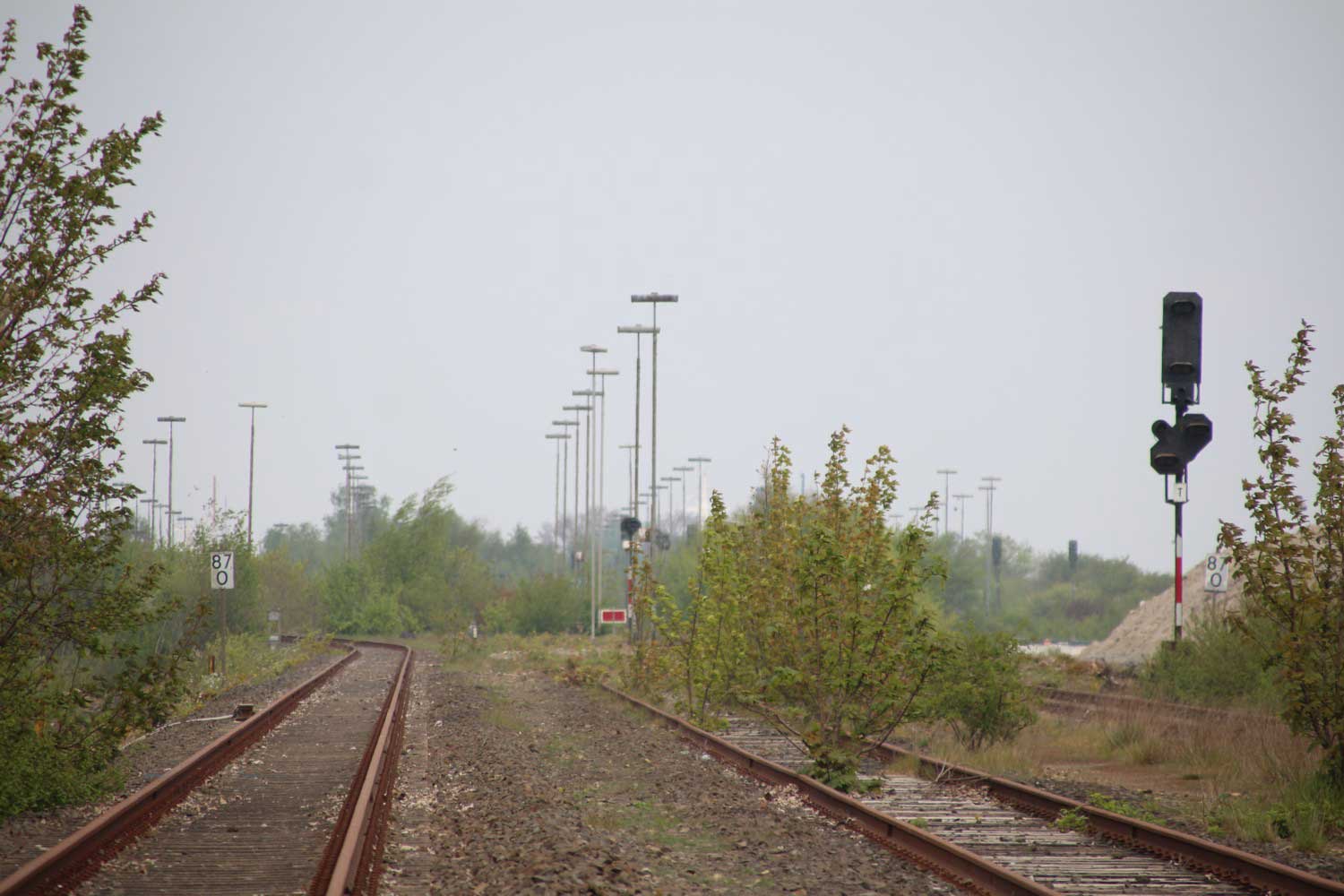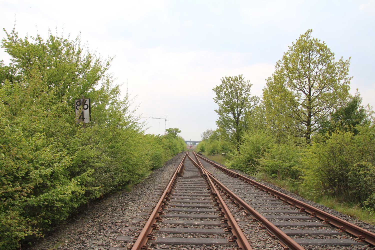 Links das Gleis führt zum Skandinavien-Kai, im Hintergrund die Brücke über die B 75.