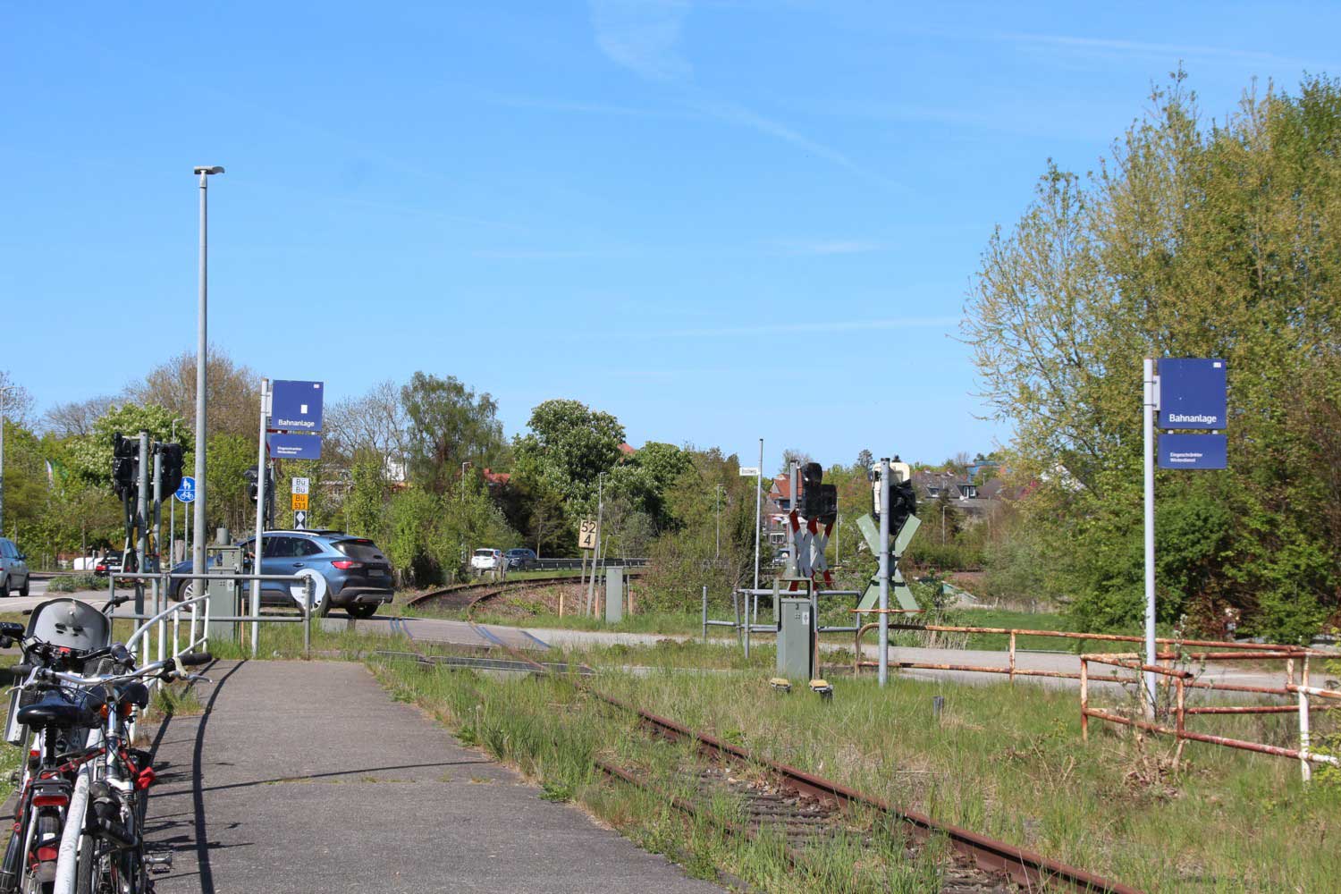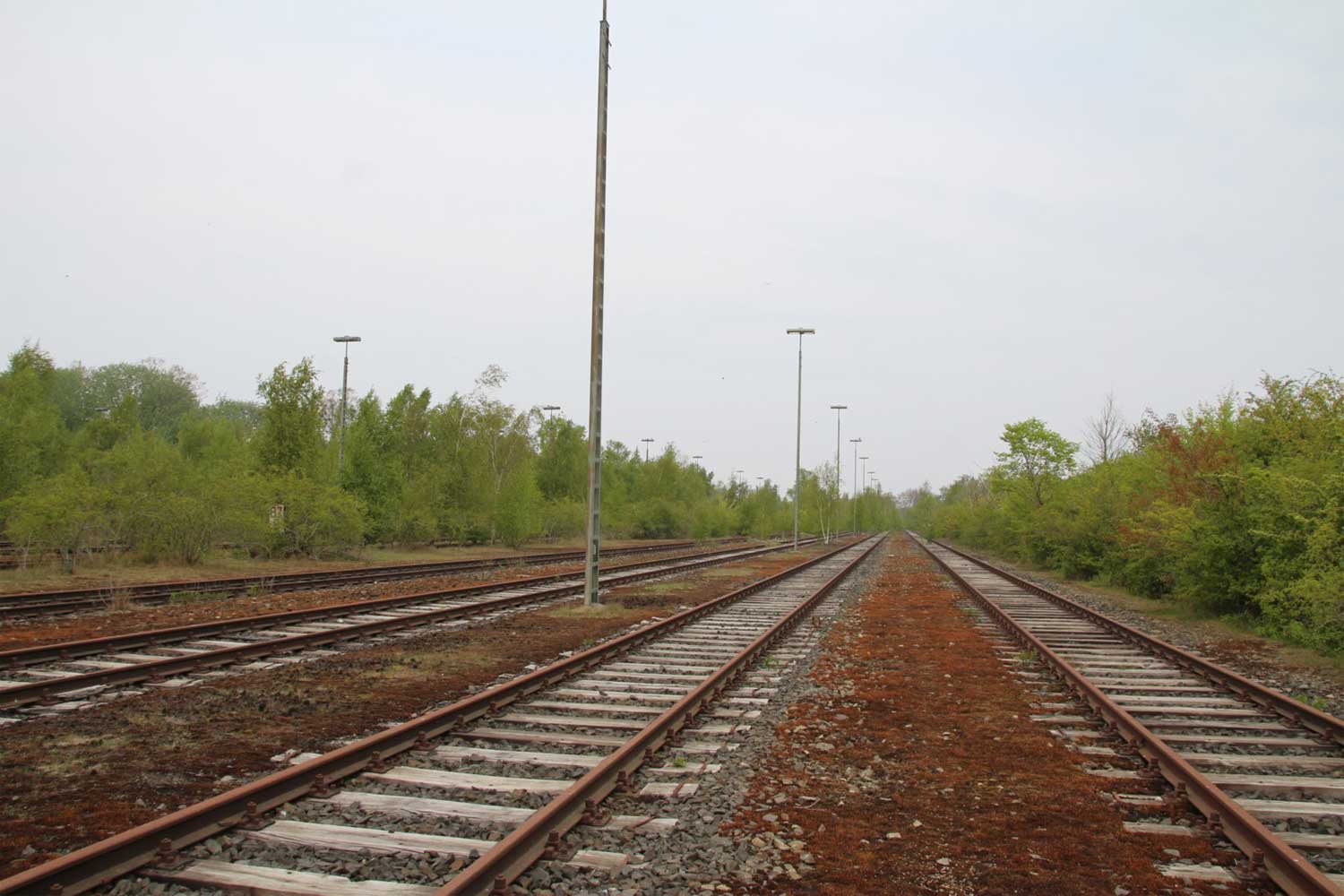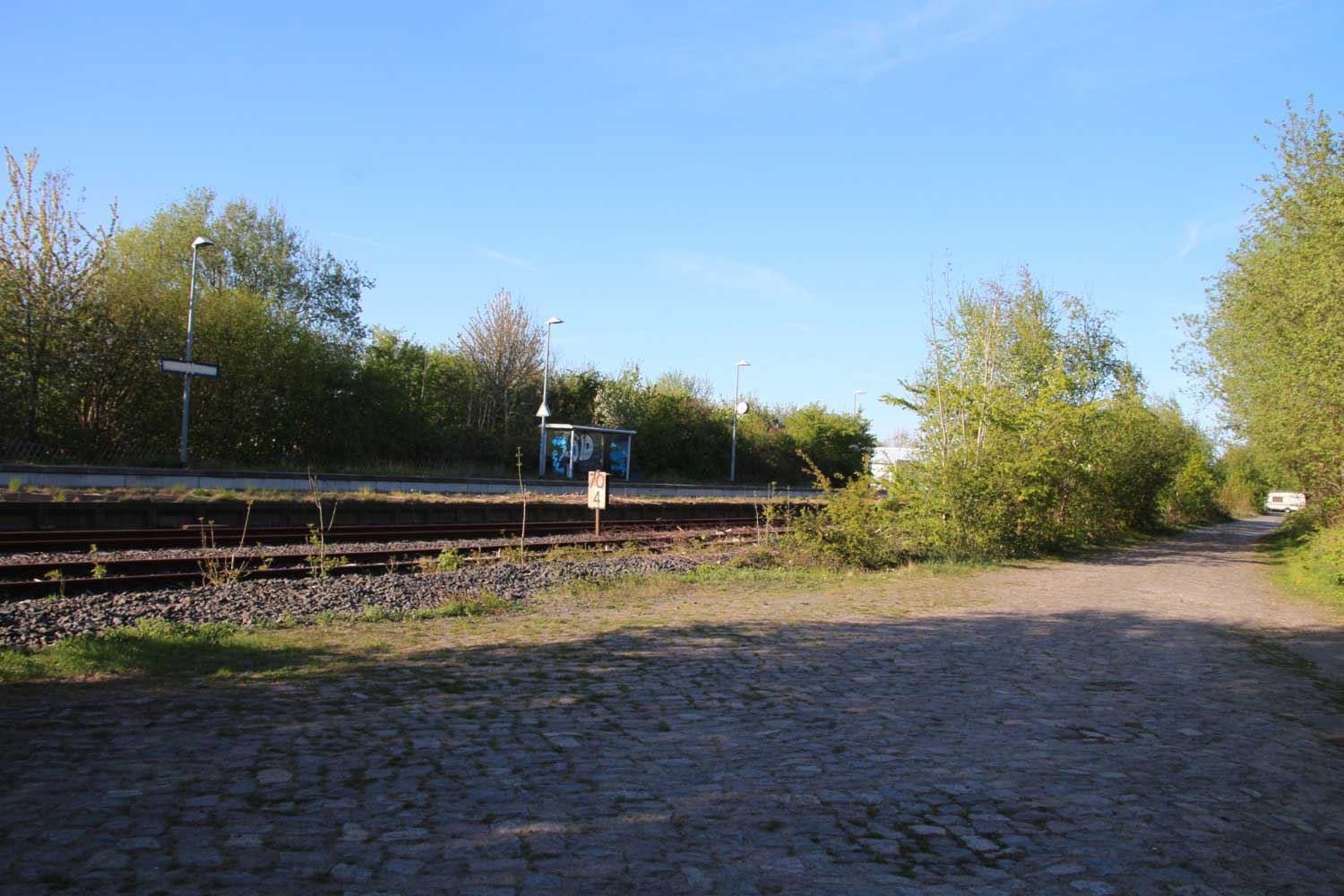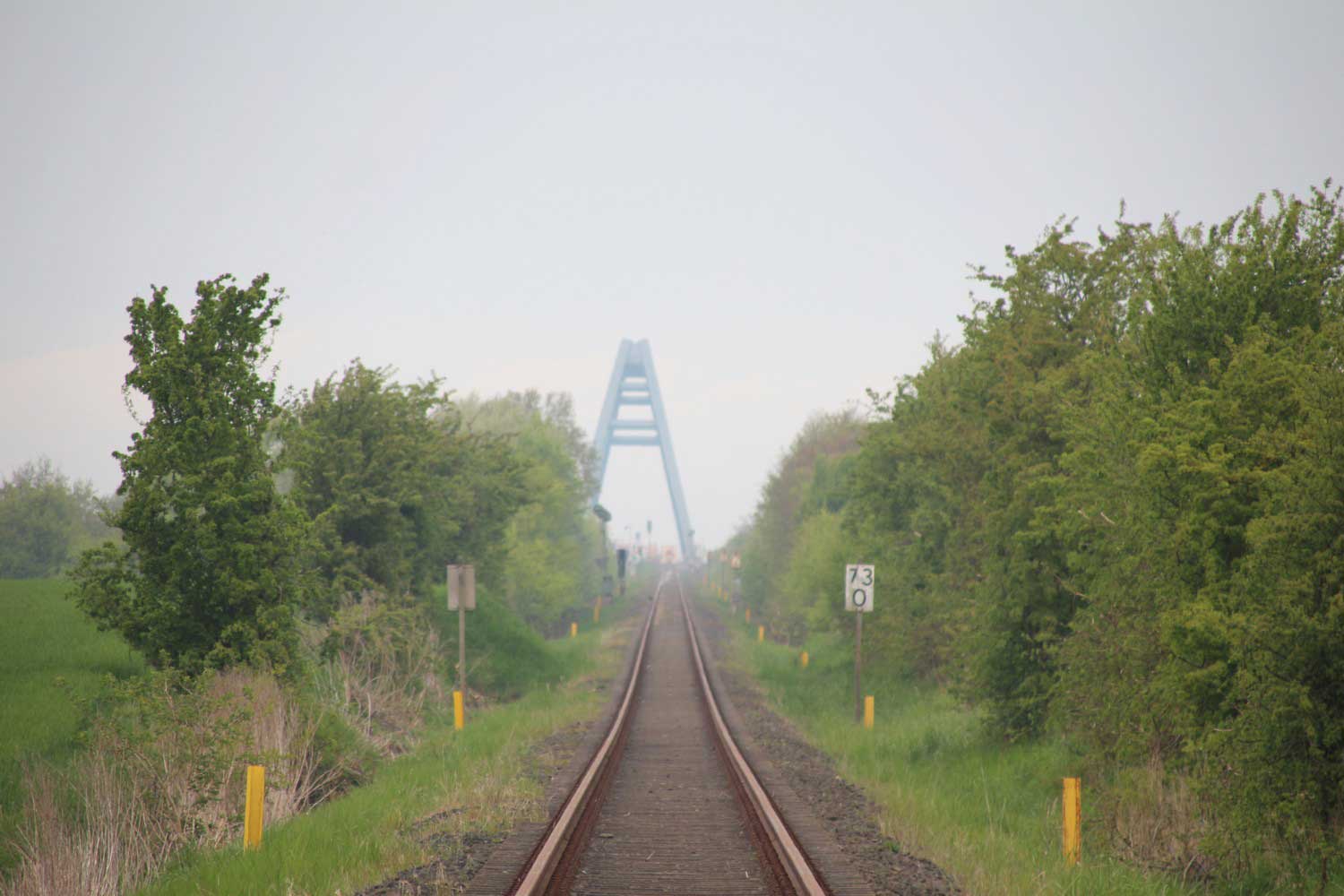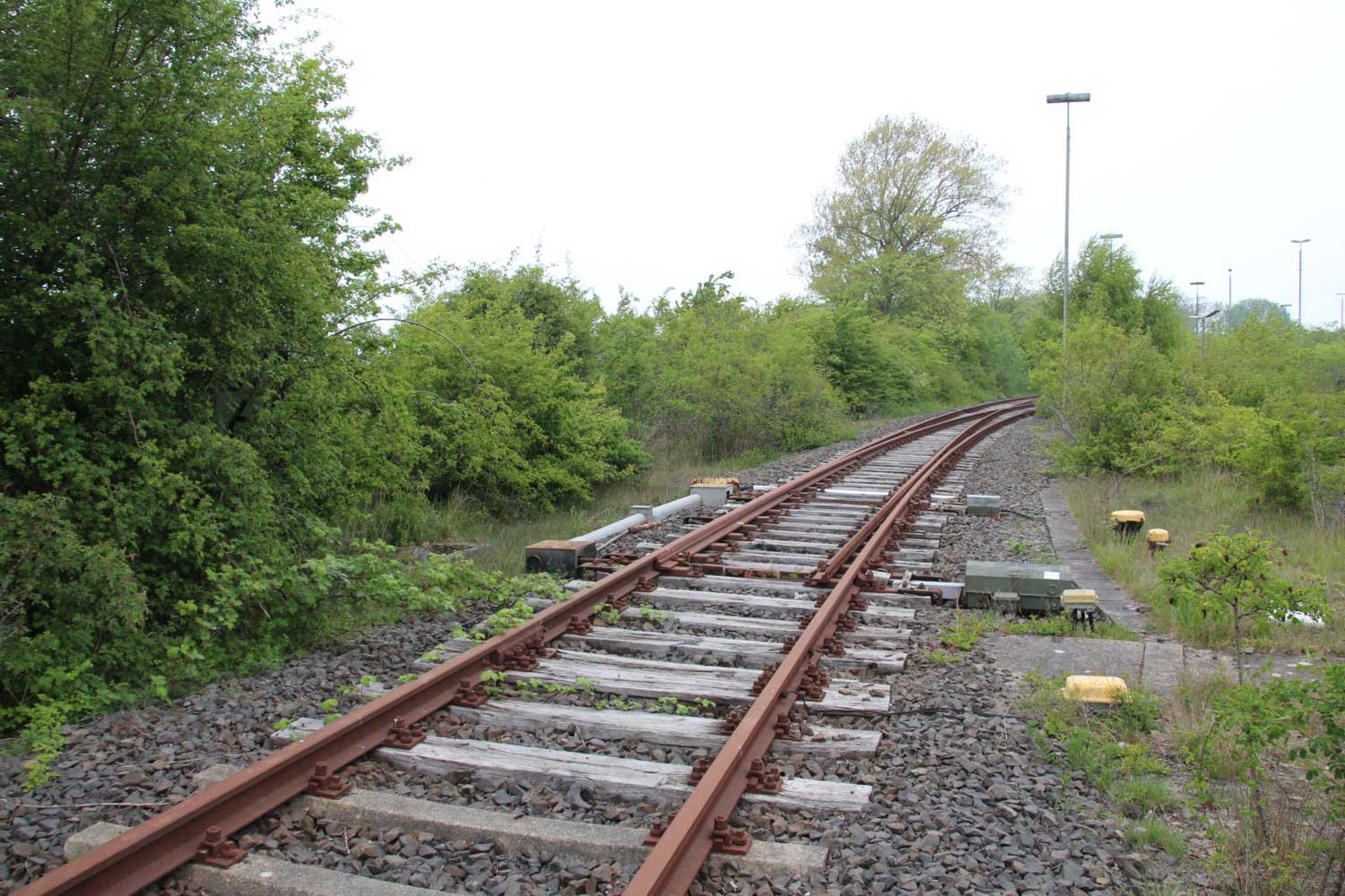 Links das Gleis führt zum Skandinavien-Kai, im Hintergrund die Brücke über die B 75.