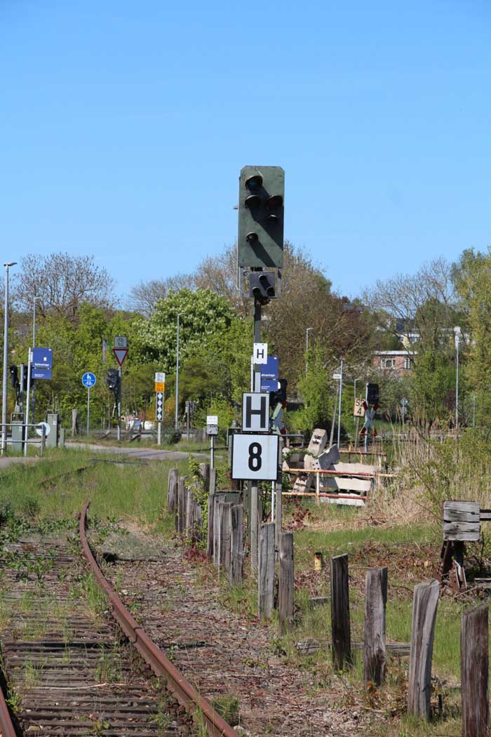 Rechts die Strecke Abzw Lübeck-Kücknitz 0,0 - Lübeck-Skandinavienkai 2,65 - Streckenende 5,20 (1117)