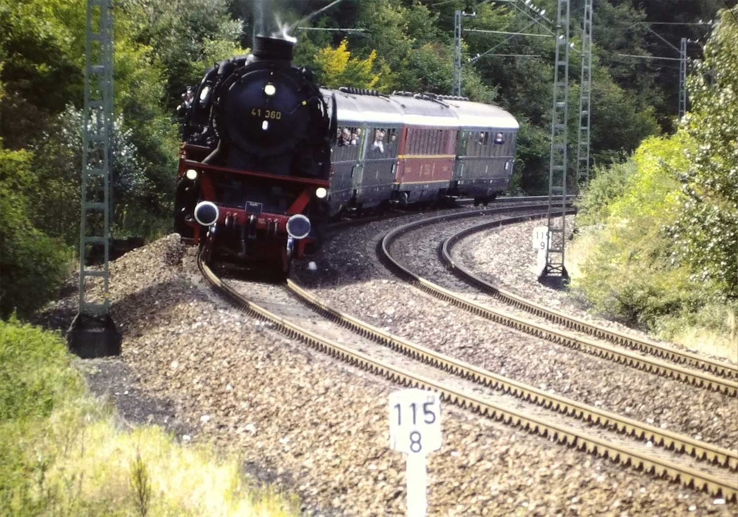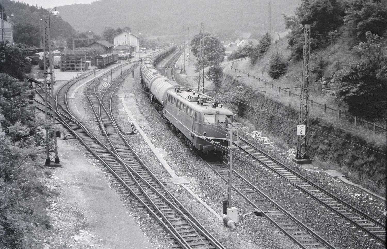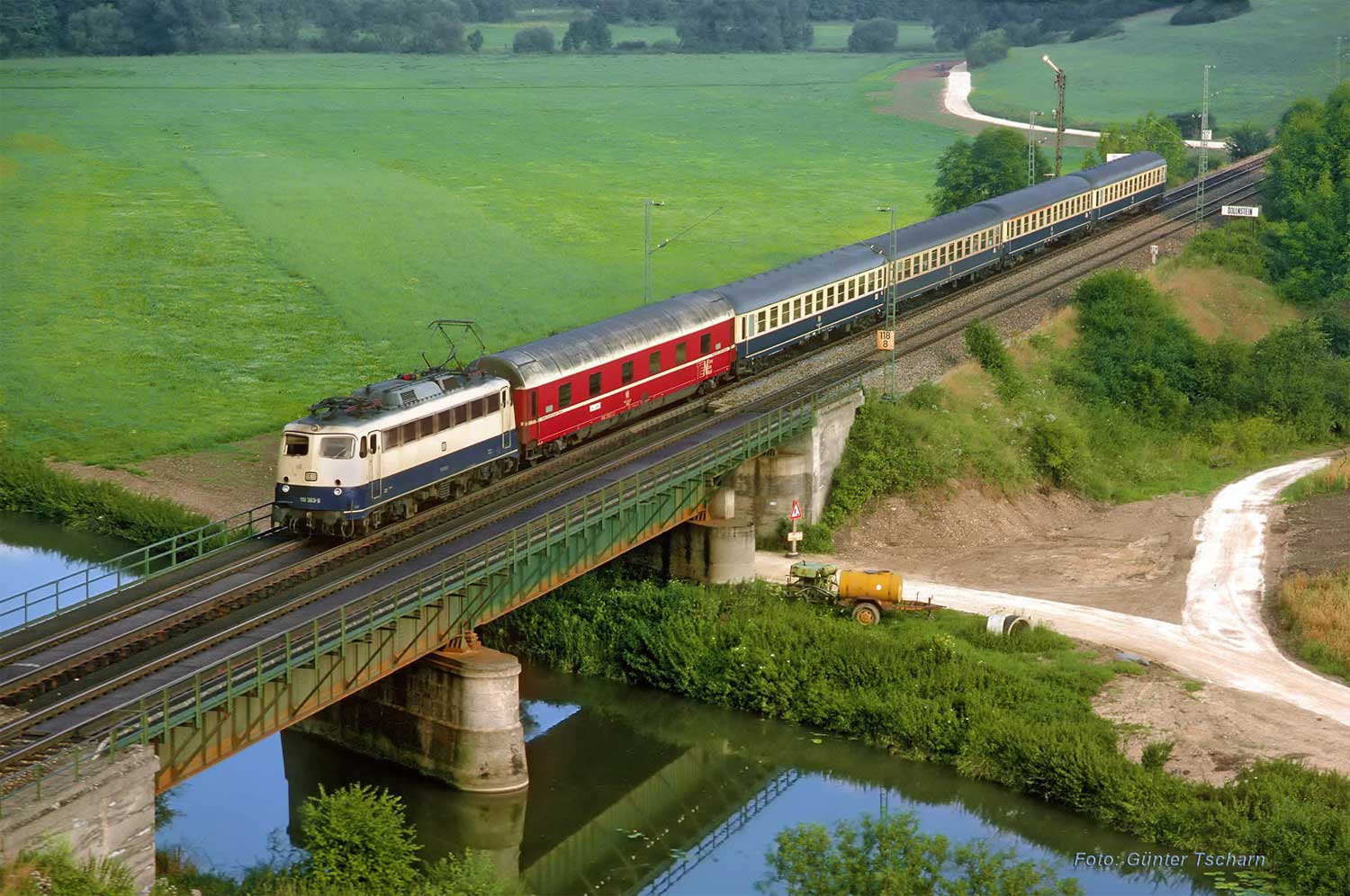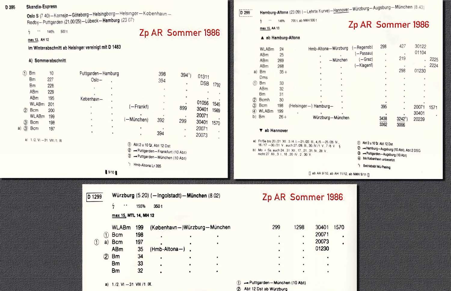 auch das Einfahrsignal. Gegen 7 Uhr kam dann die 110 363 vom Bw Hamburg-Eidelstedt mit ihrem D 1299 (Würzburg 5.20 – Treuchtlingen 6.45 – Ingolstadt - 8.02 München Hbf) heran. Erfreut nahmen wir den Hamburger Schlafwagen WLABmh 175 wahr. Erst zu Hause realisierte ich, dass es sich hier beim D 1299 lediglich um die vordere Zughälfte des D 299 KÄRNTEN-EXPRESS handelte (Hamburg-Altona 23.09 – 23.19 Hamburg Hbf 23.32 - 1.16 Hannover 1.27 – Bebra - 5.16 Würzburg 5.37 – 6.43 Nürnberg 6.52 – Treuchtlingen 7.28 – Augsburg – 8.47 München Hbf 9.00 – 14.47 Klagenfurt), der wegen des Umweges über Nürnberg eine dreiviertel Stunde später als der D 1299 in München ankam. Der D 1299 war am 30.07.1986 auffällig kurz: Gegenüber dem Reihungsplan sowie dem Zug am 31.07.1986 fehlten ihm zwei Schnellzugwagen der Bauart Bm. Außerdem zog am folgenden Tag die Münchener 111 012 der Zug in Reichertshofen. Mit Blick auf die Zugbildung war besonders interessant, dass in Hamburg Hbf drei Wagen an den Schluss des D 299 angehängt wurden: nämlich den jetzt auf dem Bild hinter der Lok laufenden WLABmh 175 sowie die beiden folgenden Liegewagen Bcm. Die Drei waren schon am Vortag im dänischen Helsingör auf die lange Reise nach Bayern gegangen, indem sie dort vorne dem D 395 SKANDIA-EXPRESS (Oslo 7.40 – Göteborg – Helsingör – Kopenhagen – 21.00 Puttgarden 21.25 – 23.07 Hamburg Hbf) zugefügt worden. Dieses System der Zugbildung bzw. Kurswagen fand ich ausgesprochen faszinierend. |