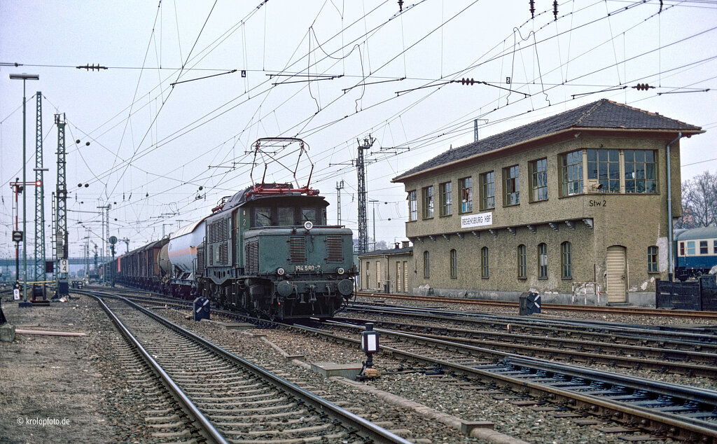 Am Regensburger Rbf (km 2,2; nicht zu verwechseln mit Regensburg Ost Rbf) [railnav.geopp.de] fanden wir das schöne Stellwerk 5, das als Motiv für den D784 Passau – Würzburg – Hannover – Hamburg-Altona mit 111 020 an der Spitze herhalten musste.