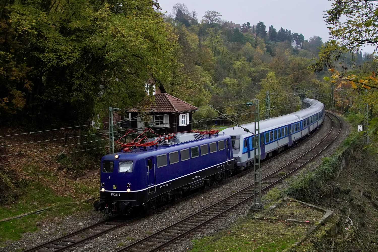 Der Zug befindet sich auf den Gegenrichtungsgleis der Strecke Stuttgart Hbf - Osterburken (4800)