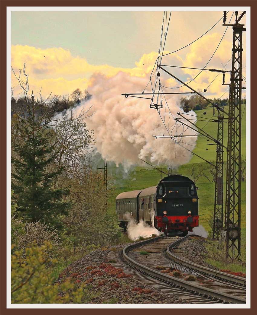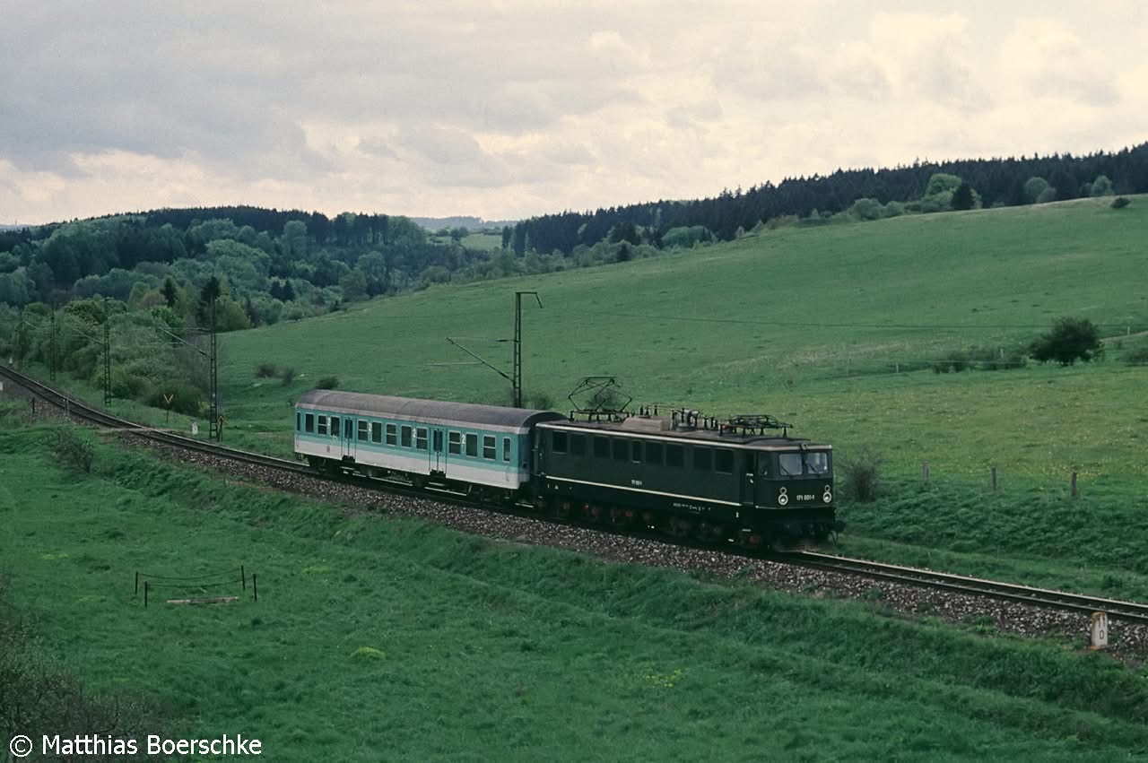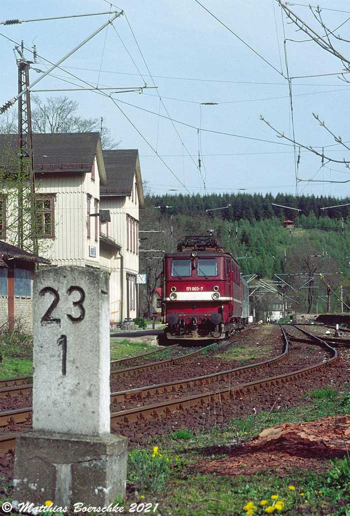 Der Zug befindet sich auf dem Anschlussgleis zu den Kalkwerken, rechts das Streckengleis