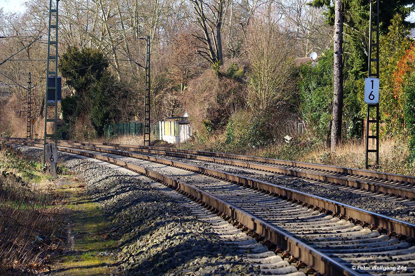 km 1,6 (Stein und Tafel) zwischen Abzw Hanau Rauschwald und Großkrotzenburg - Blick Richtung Abzw Hanau Rauschwald