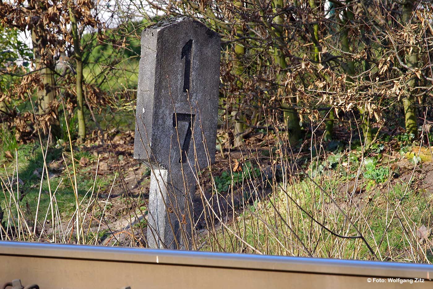 km 1,8 (Stein und Tafel) und km 1,9 (Stein) zwischen Abzw Hanau Rauschwald und Großkrotzenburg - Blick Richtung Großkrotzenburg