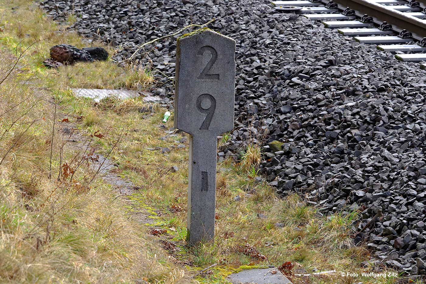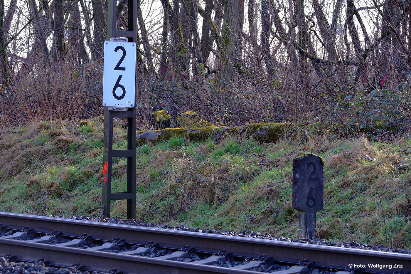 Rechts km 30,5 (Stein) und km 30,6 (Tafel) der Strecke