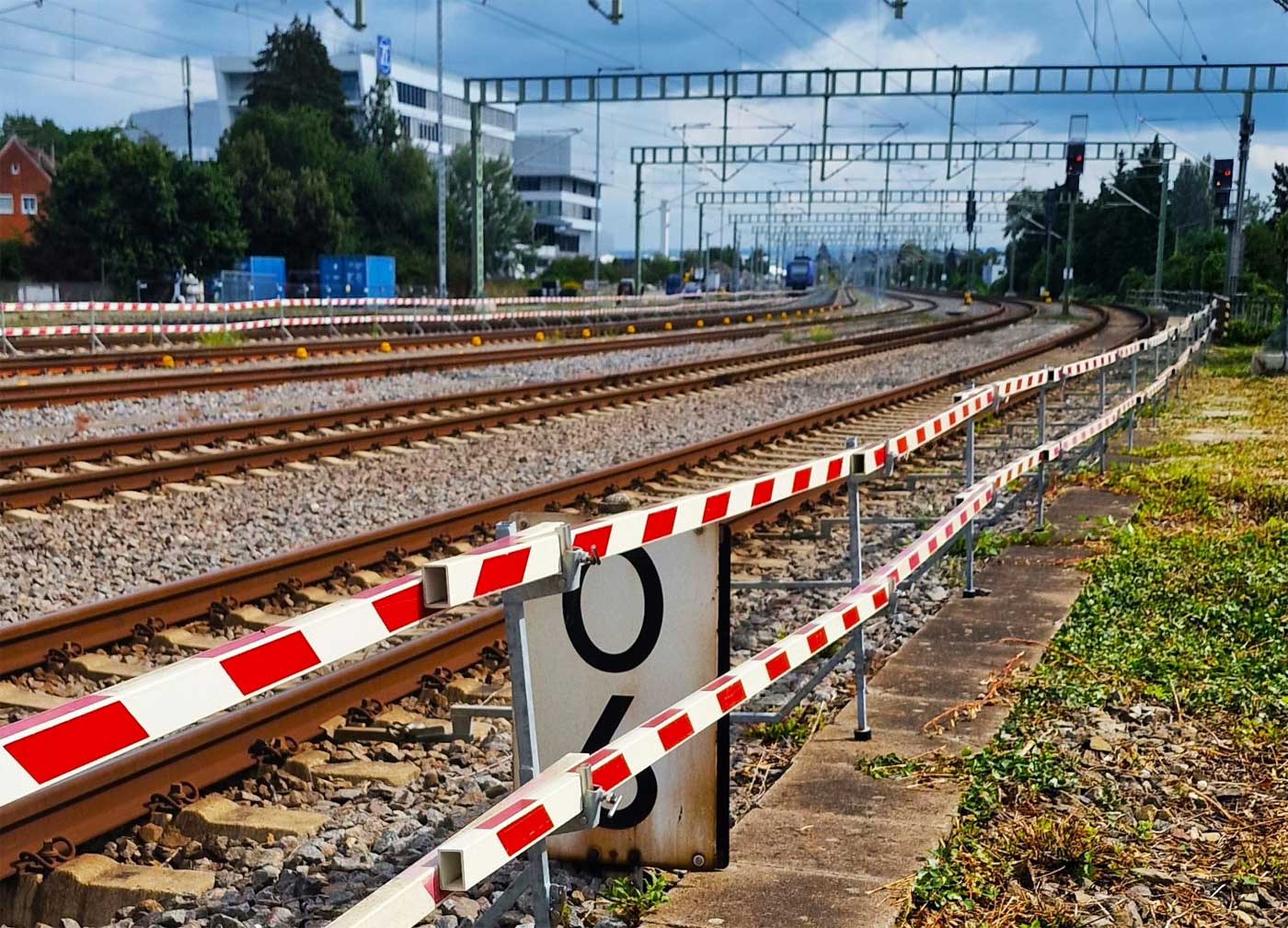 Im Hintergrund links St. Canisius und rechts das Stellwerk FrHafen 4 für den Fährenbetrieb nach der Schweiz.