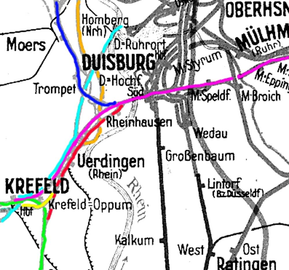 dunkelblau: Rheinhausen - Moers - Menzelen West (hoch) - Kleve