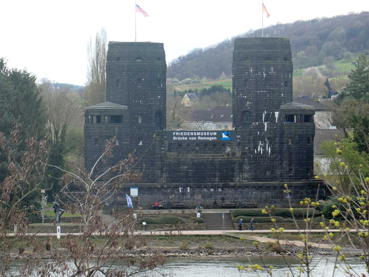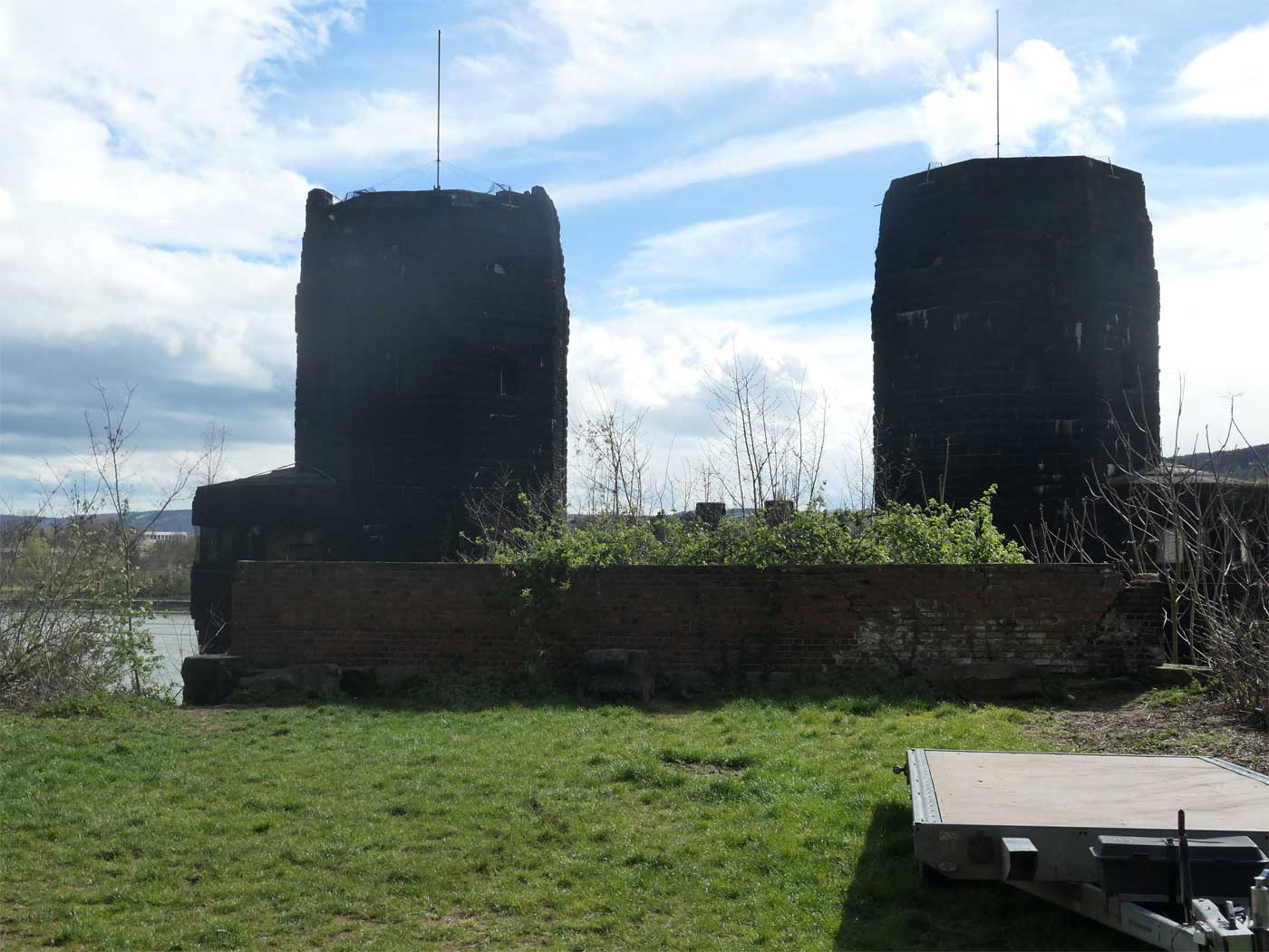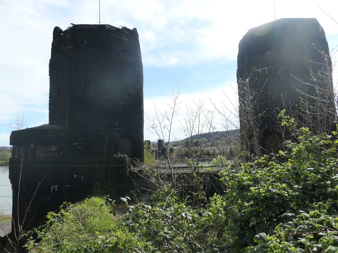 Im Vordergrund die rechtsrheinischen Brückentürme der Ludendorffbrücke