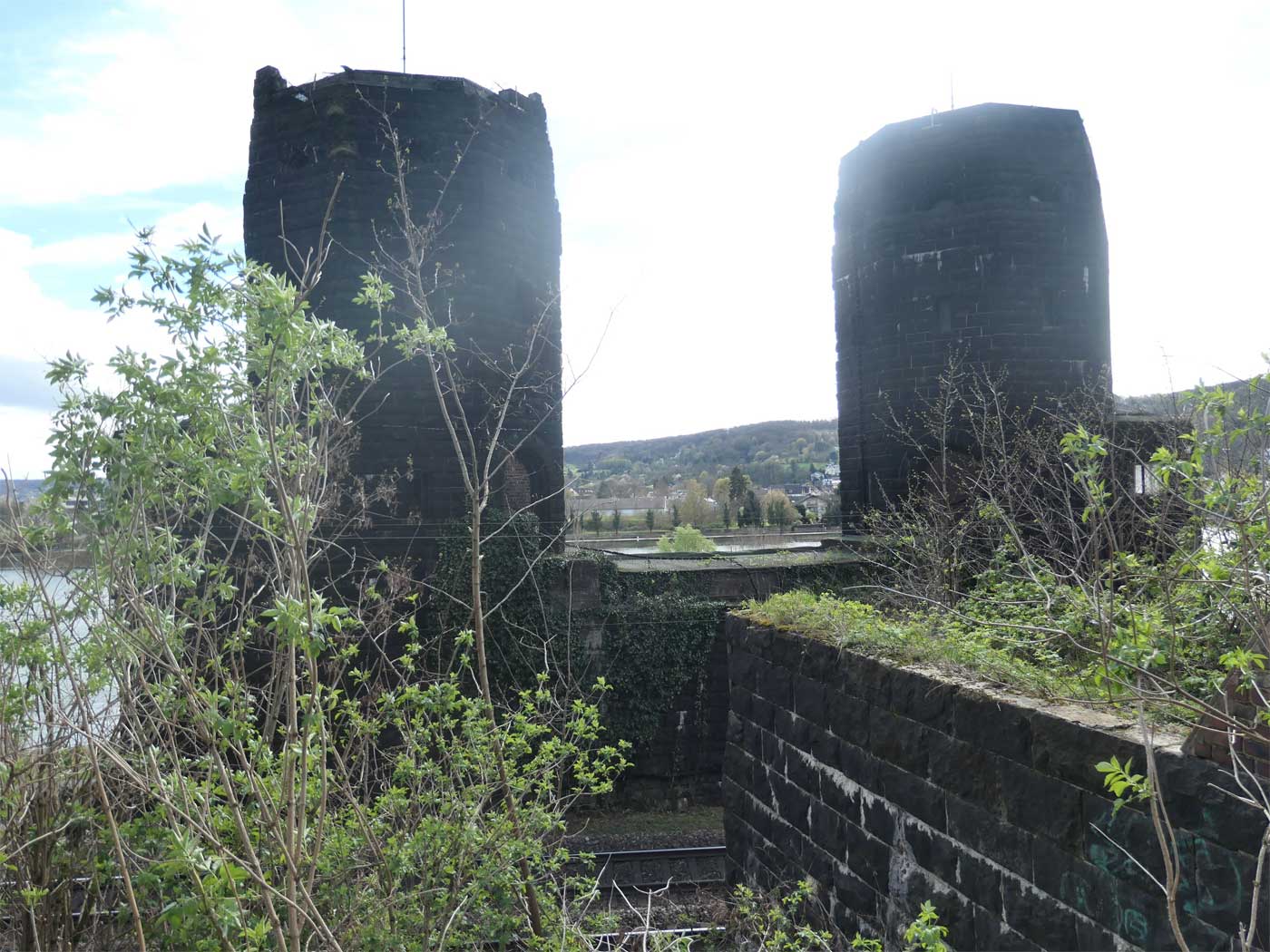 Blick vom Südportal des Erpelerley-Tunnels (bei km 1,3) zu den linksrheinischen Brückentürmen (bei km 1,7) der Ludendorffbrücke