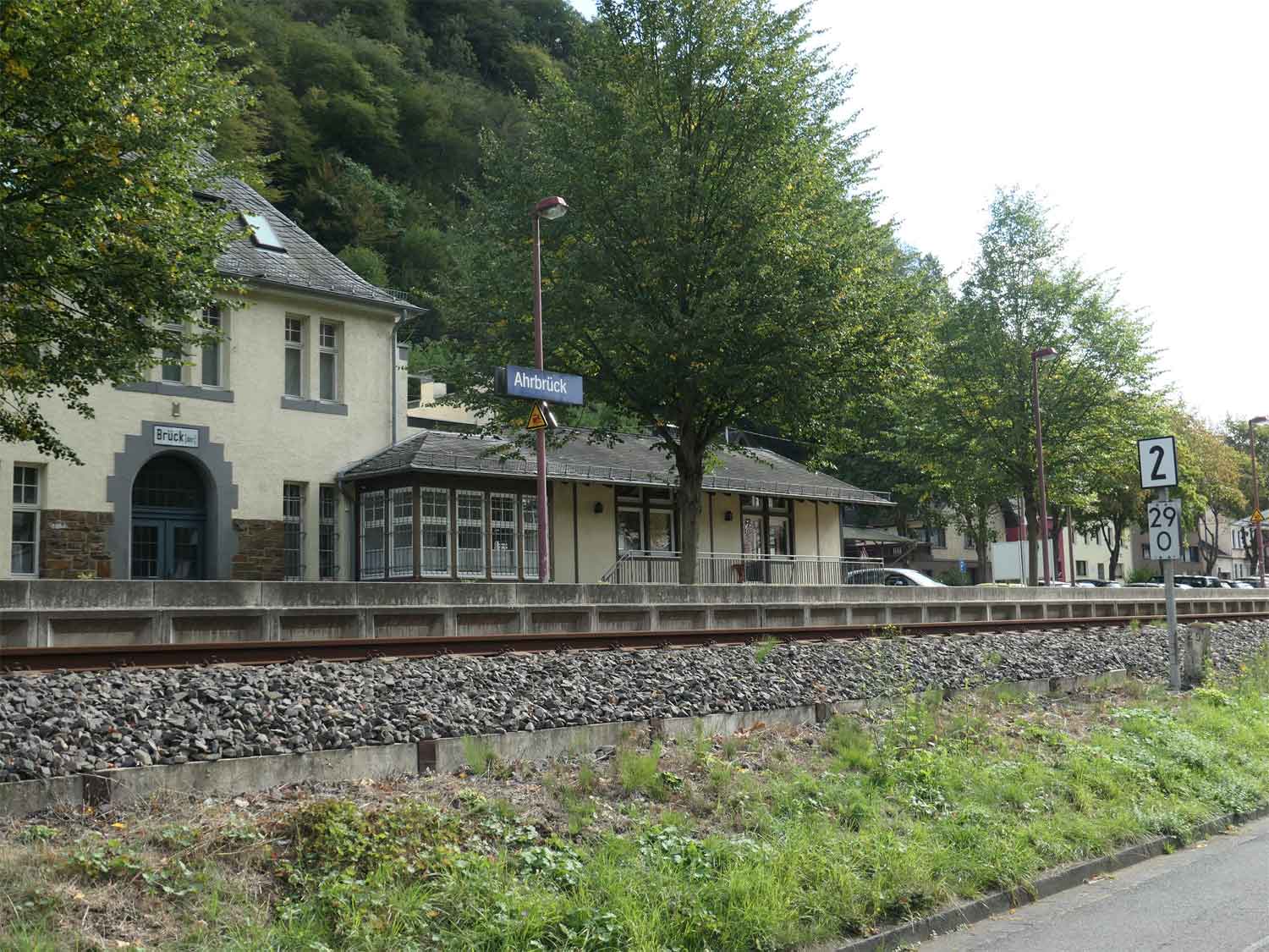 km 29,0 (Stein und Tafel) in Ahrbrück - Am Gebäude noch die frühere Bezeichnung: Brück (Ahr)