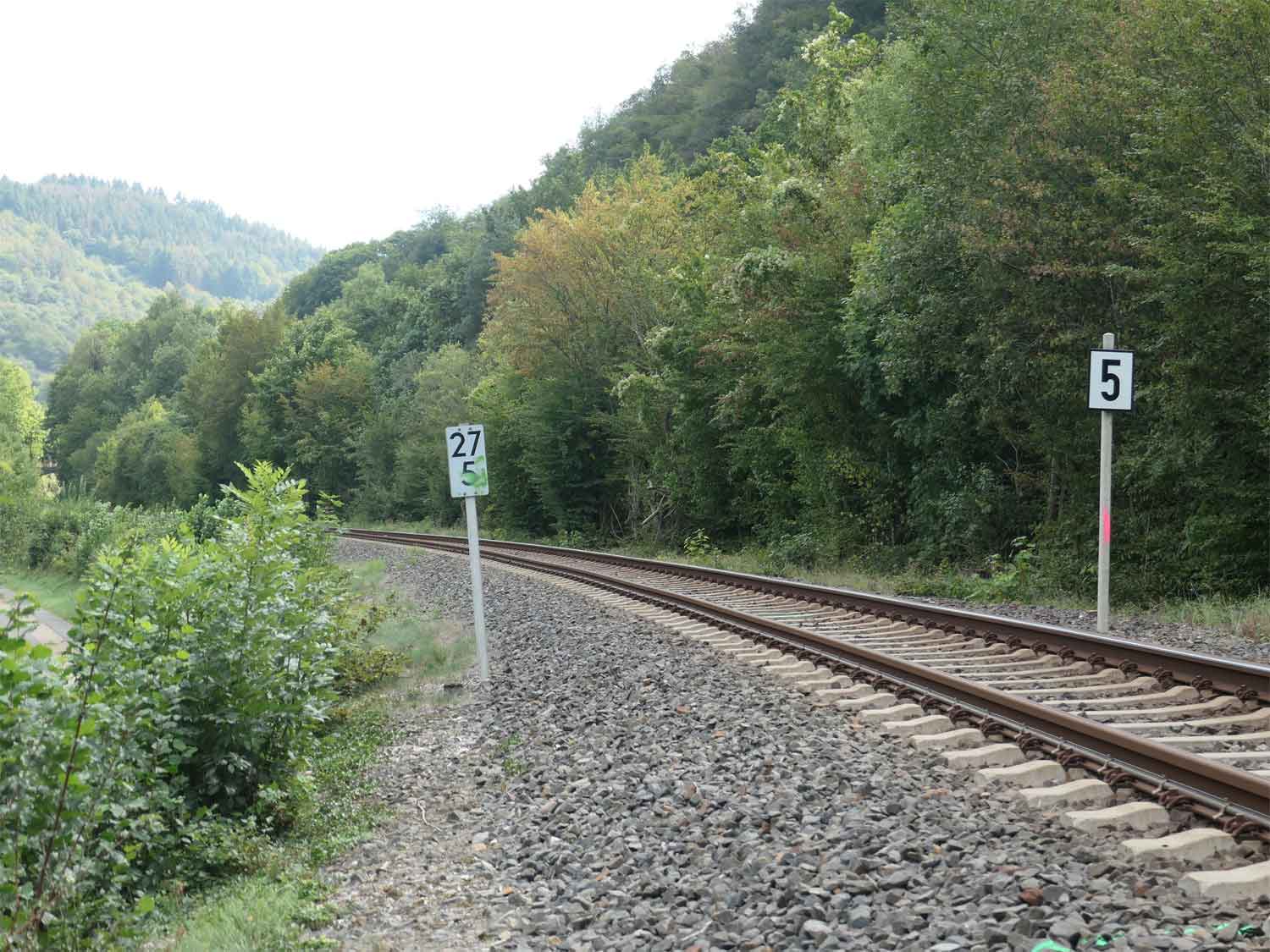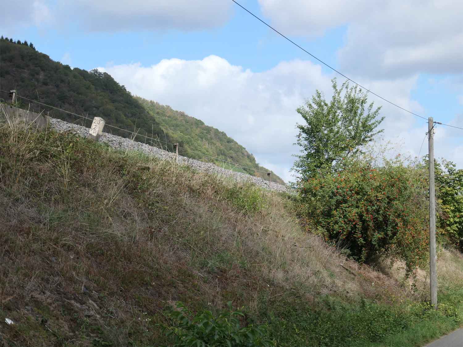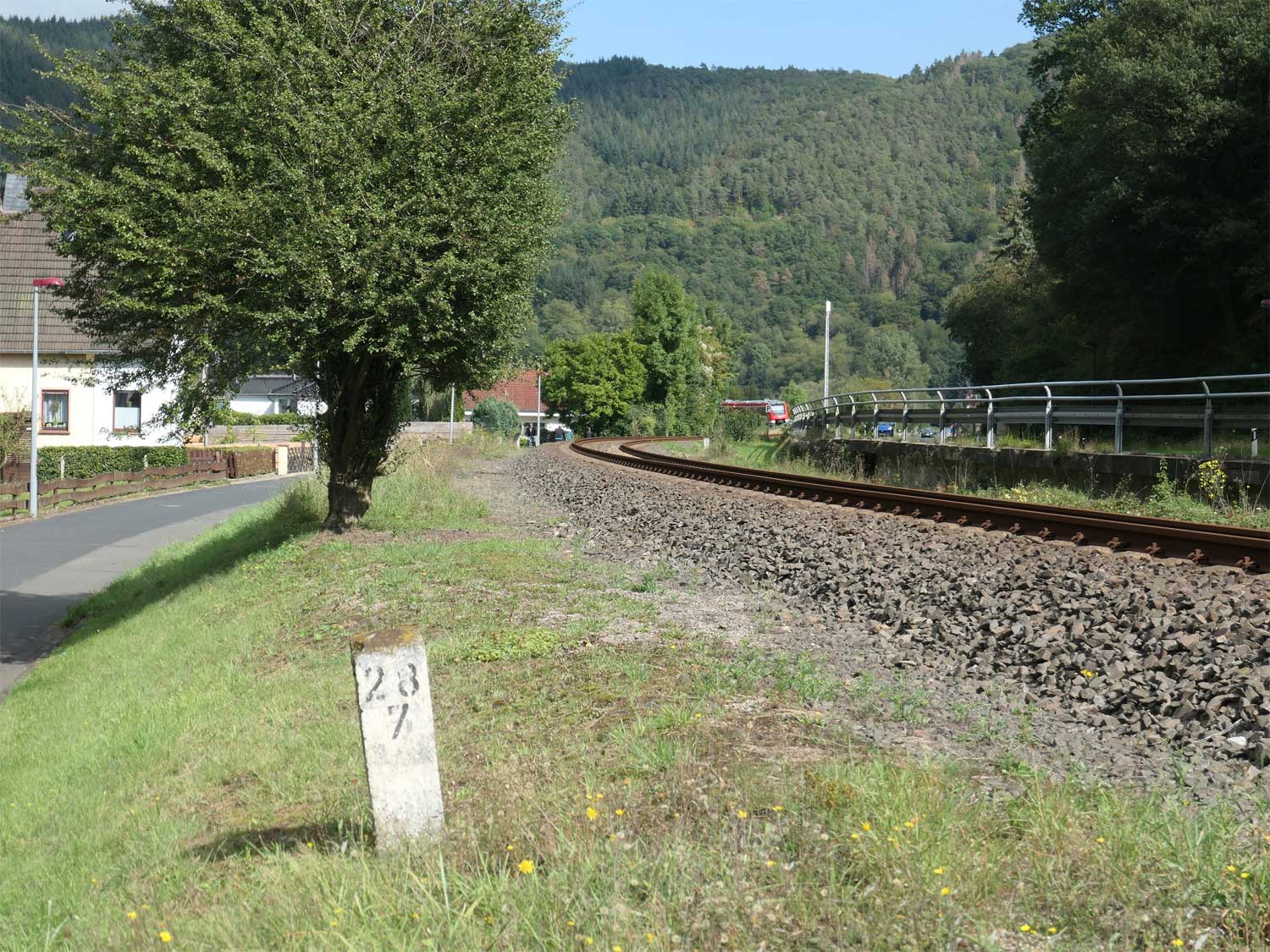 km 28,5 (Tafel) und km 28,6 (Stein) zwischen Kreuzberg und Ahrbrück - Blick Richtung Remagen