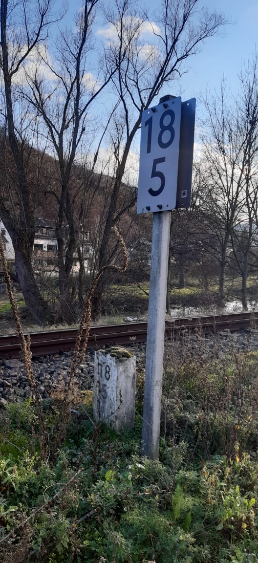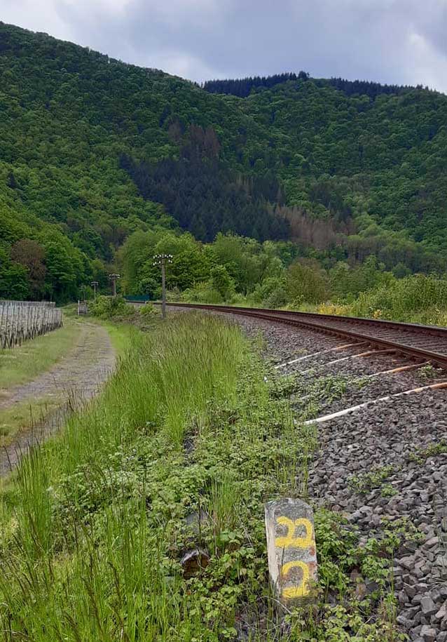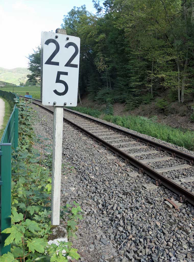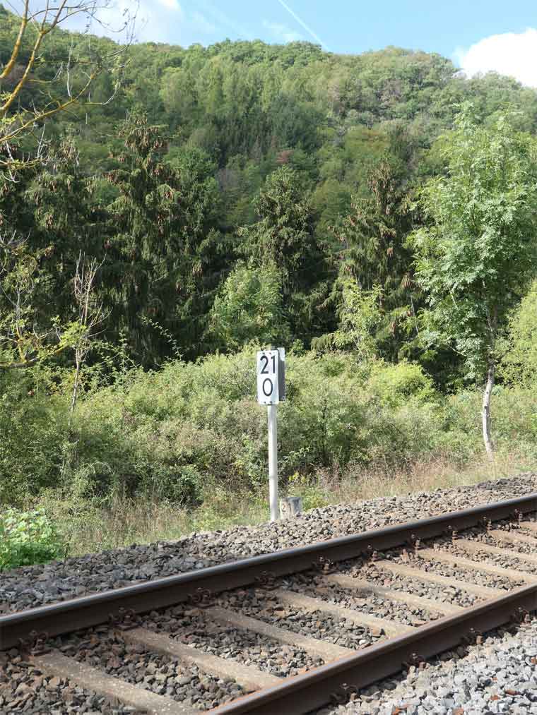 km 28,5 (Tafel) und km 28,6 (Stein) zwischen Kreuzberg und Ahrbrück - Blick Richtung Remagen
