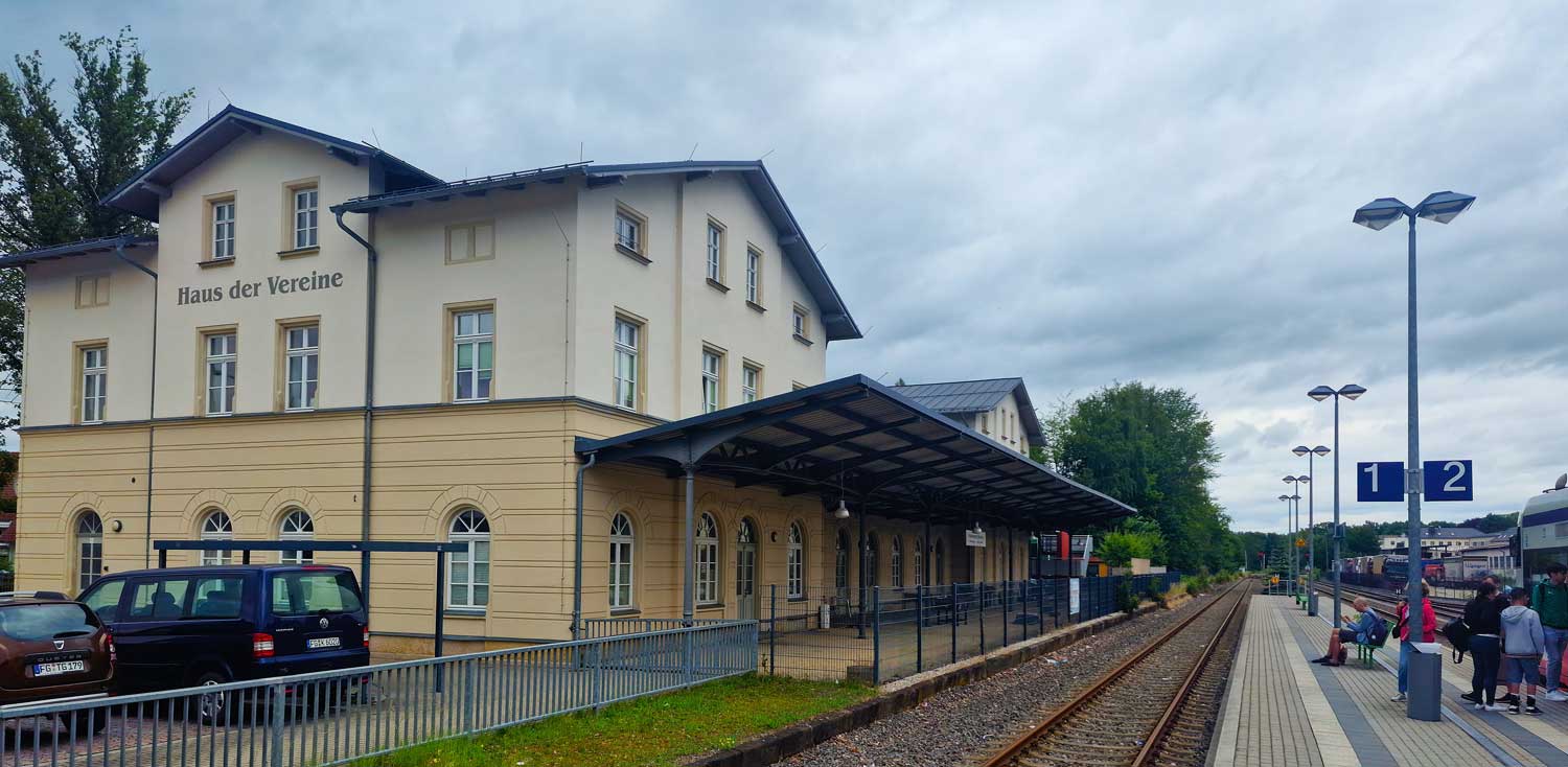 km 0,7 und km 0,9 lehnen am Empfangsgebäude in Roßwein