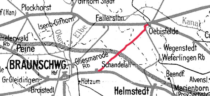 Wittingen–Oebisfelde ersetzte. Dies war noch nicht zufriedenstellend, und so wurde 1955 eine Verbindungskurve an die Hauptstrecke nach Wolfsburg gelegt. |