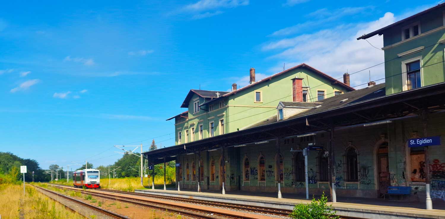 | St. Egidien | 19,78 | km 104,91 der Strecke Dresden Hbf -0,048 - Chemnitz Hbf 79,73 - Zwickau (Sachs) Hbf 128,35 - Abzw Werdau Bogendreieck (Neumarker Spitze) 136,23 (DW) |