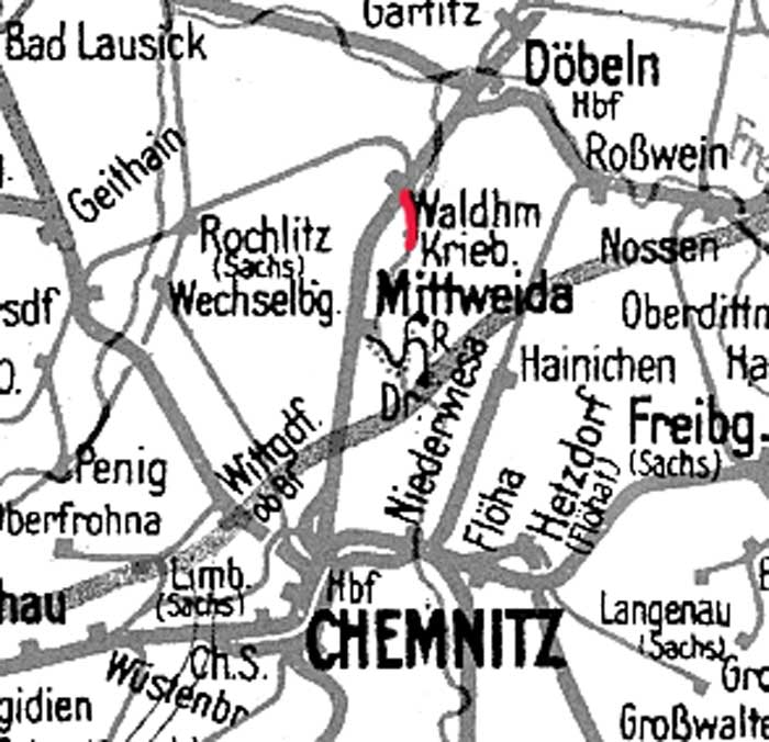 | Waldheim | 0,0 | km 34,93 der Strecke Riesa - Döbeln - Chemnitz (RC) |