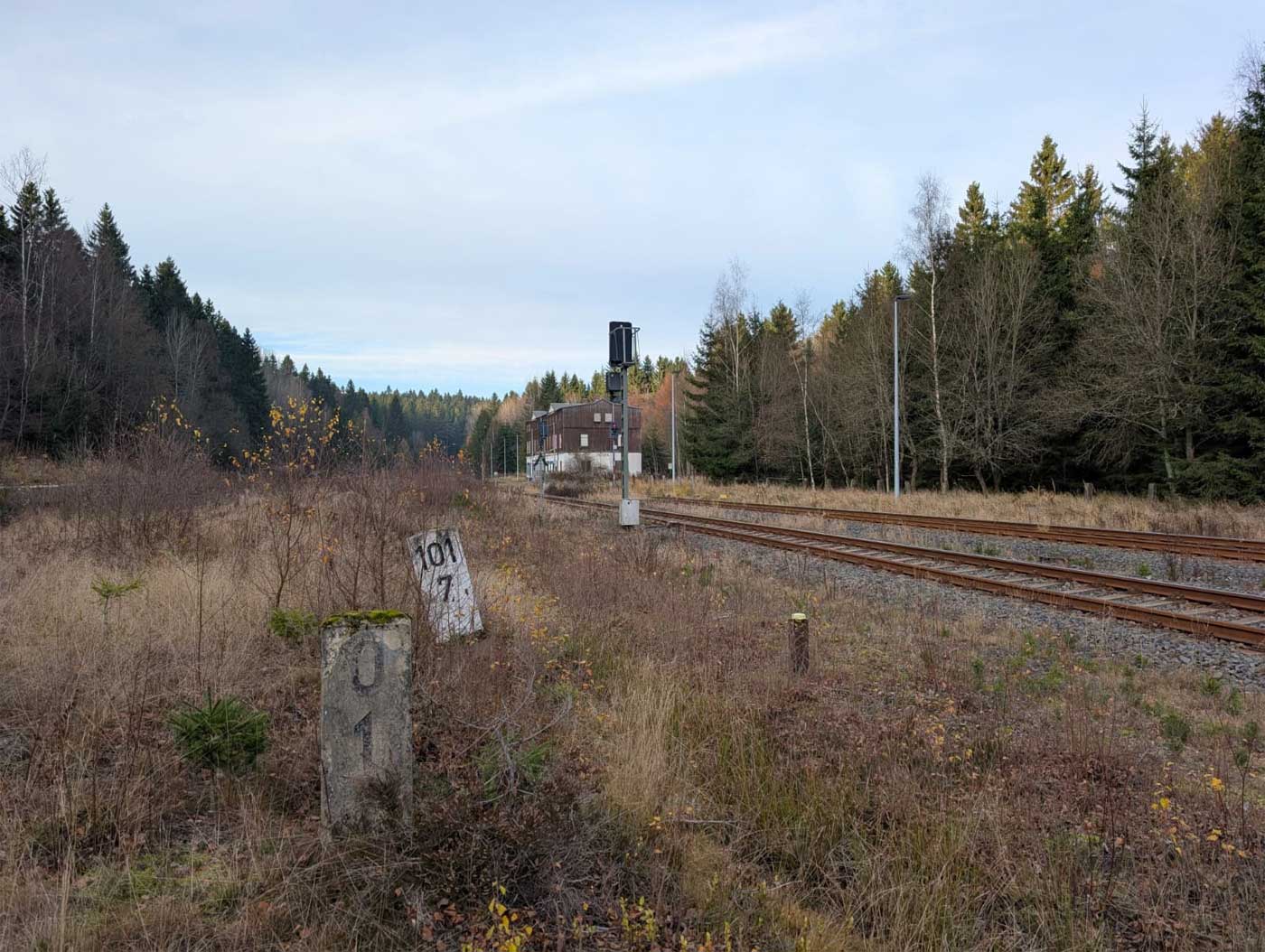 km 101,7 gehört zur Strecke Chemnitz Hbf 0,0 - Aue (Sachs) 50,80 - Adorf (Vogtl) 114,47 (CA)
