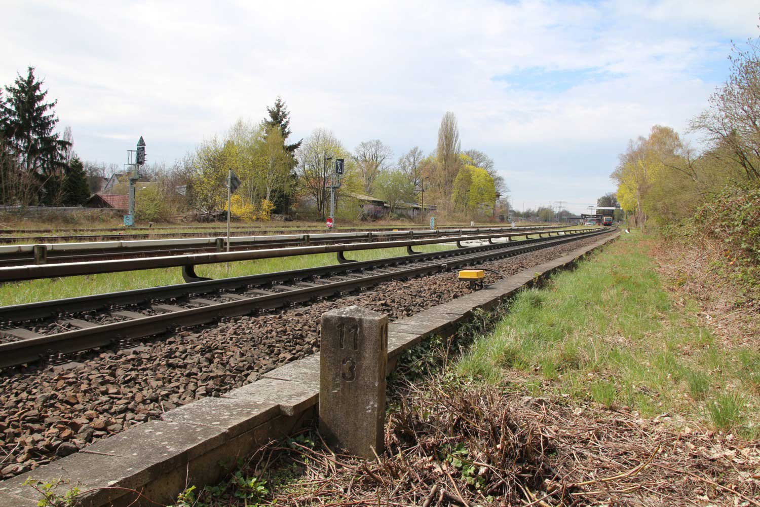 km 16,6 (links) in Hoppegarten (Mark) - Blick Richtung Strausberg km 16,6 (rechts) gehört zur Ostbahn (6078) Foto: Matthias Manske, April 2025