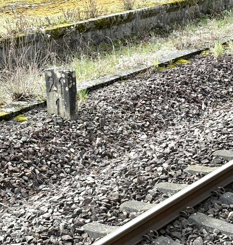 | km 0,0 der Strecke Zweibrücken Hbf 0,0 - Bierbach 6,87 - Reinheim (Saar) 24,27 - Grenze Deutschland/Frankreich 25,087 - Sarreguemines (Saargemünd) 36,80 | ||