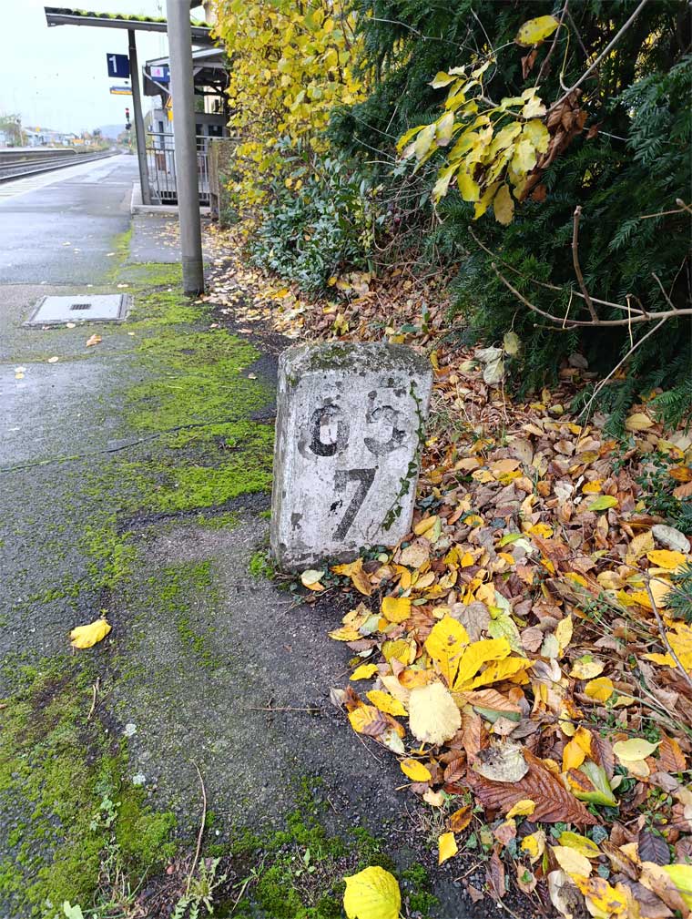 | km 0,0 der Strecke Koblenz Hbf 0,0 - Trier Hbf 111,57 - Perl 159,05 - Grenze Preußen/Lothringen 159,512 = km 22,176 - Apach (Lothr) 21,157 - Diedenhofen 0,0 | ||