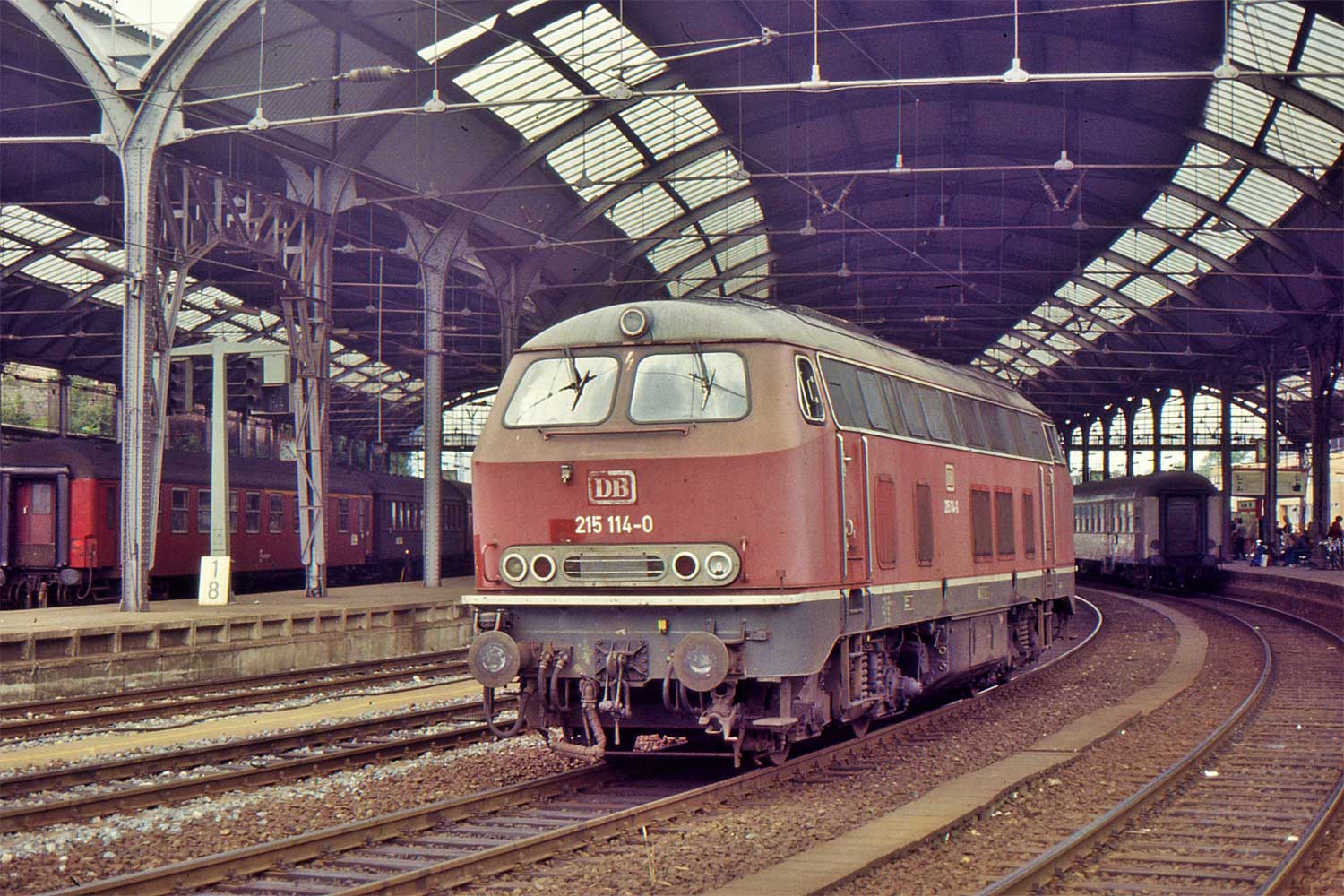 215 044 schiebt den D 234 (Kopenhagen - Paris-Nord) am 08.07.1977 aus dem Aachener Hbf die Rampe nach Aachen-Süd hinauf.