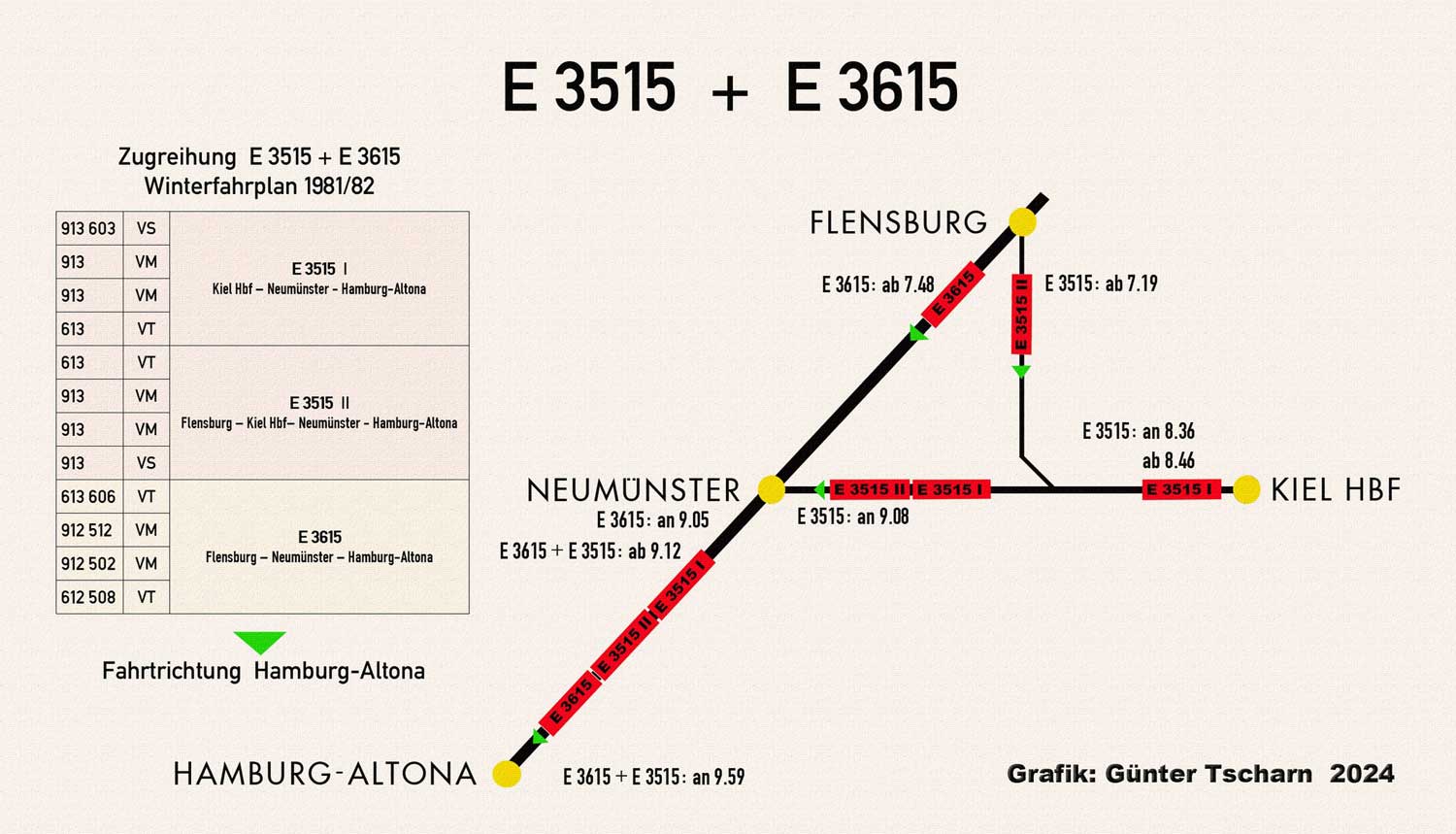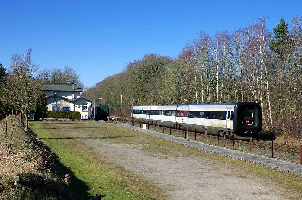 (Hamburg-Altona 0,74) - Elmshorn 30,70 - Wrist 52,23 - Neumünster 74,69 (kommend)/74,64 (gehend) - Schleswig 138,39 - Flensburg Abzw Weiche 171,15 - Abzw Friedensweg 174,57 - Grenze Deutschland/Dänemark 179,784 = (km 110,650 - Padborg 109,7 - Tinglev 95,3 - Fredericia 0,0)