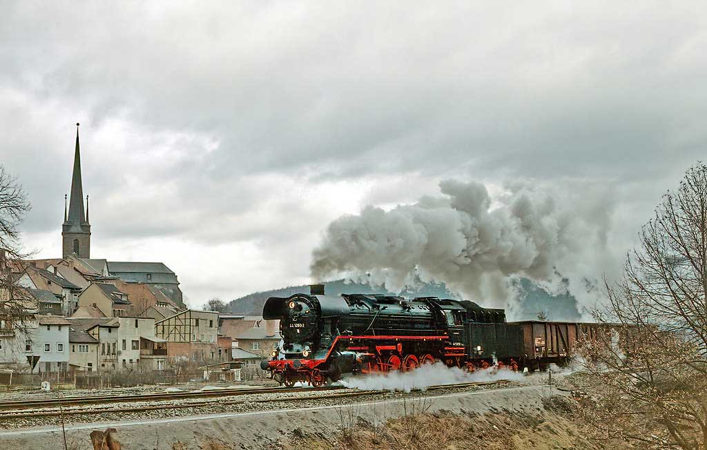 Diese Aufnahme stammt vom 14.12.1980 und zeigt die 44 0757 bei der Einfahrt in den Bahnhof Saalfeld. Der Tannenzweig an der Rauchkammer deutet auf die Vorweihnachtszeit hin, die es auch in der DDR gab. Rechts km 139,5 der Strecke Leipzig/Leutzsch - Probstzella Foto: Henning Gothe |