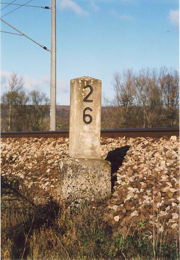 Alter Null-Kilometerstein der Verbindung zwischen der Thüringischen und Saalbahn bei Bf Großheringen (Länge. 1,16 km Eröffnet: 01.05.1899) Im Hintergrund: km 57,0 alt und neu der Strecke Halle - Guntershausen