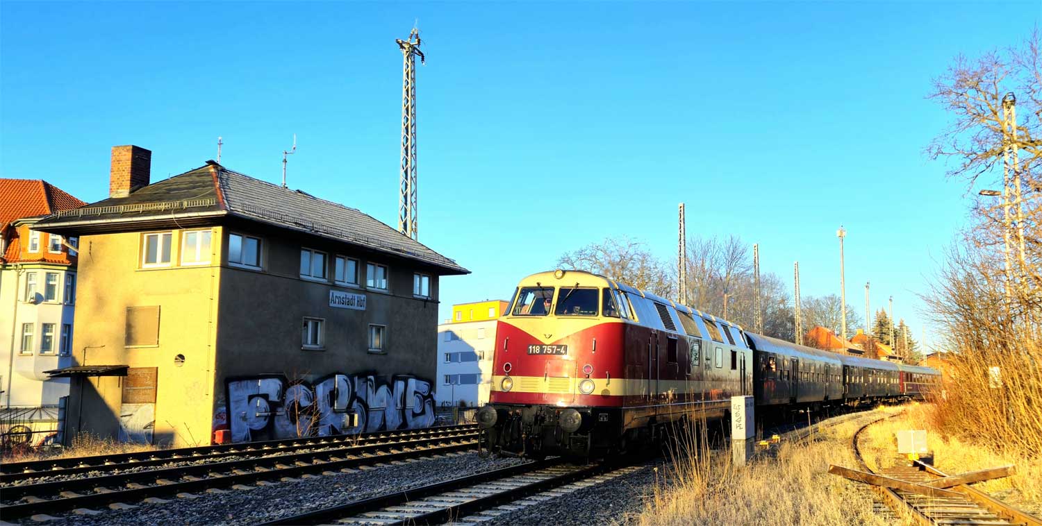 | km 0,00 der Strecke (Arnstadt Hbf 0,0) - Arnstadt Ost 0,37 - Ichtershausen 5,46 | ||
