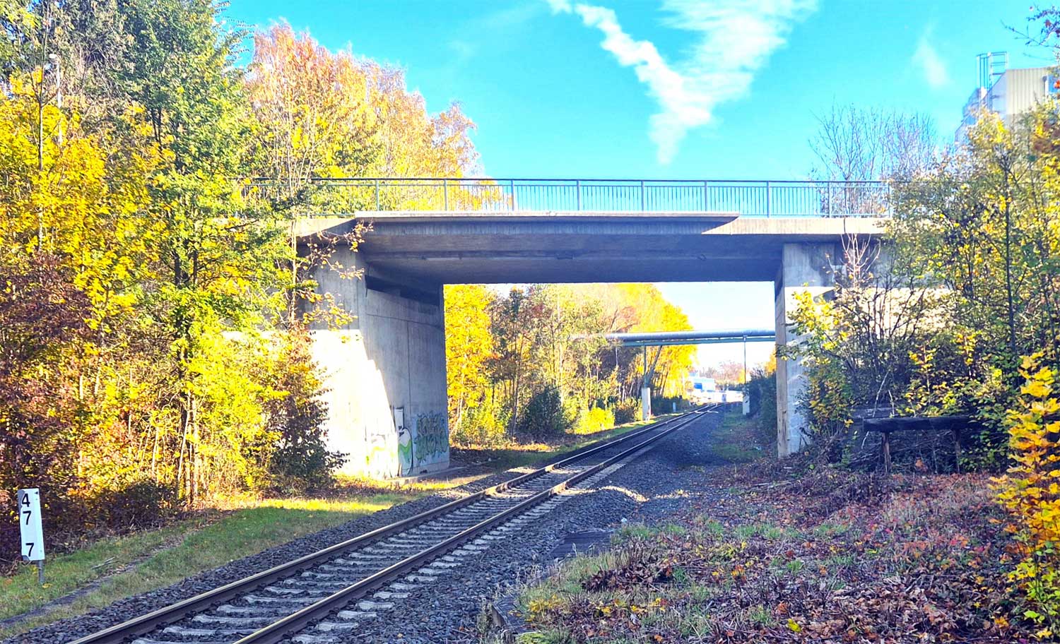 Stabbogenbrücke überspannt die Strecke Halle (Saale) Hbf - Guntershausen mit km 86,2