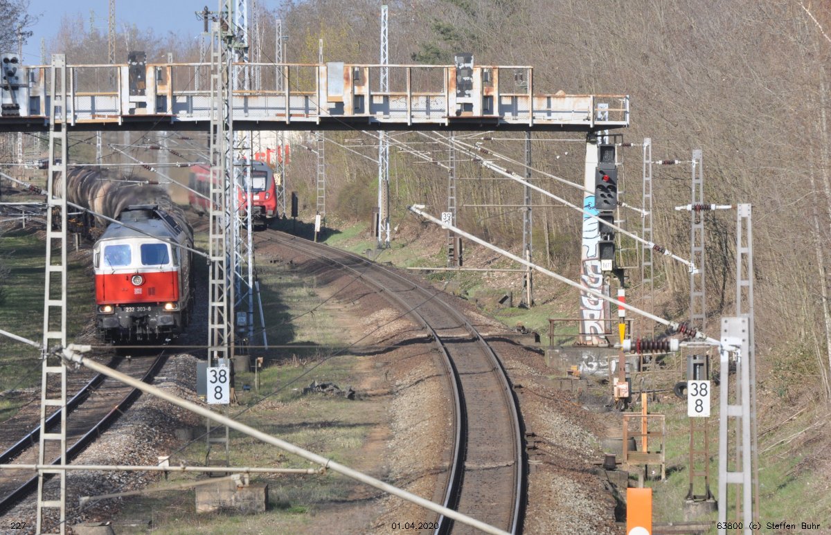 Halb rechts ankommend das Gegenrichtungsgleis (lange Kurve) der Strecke