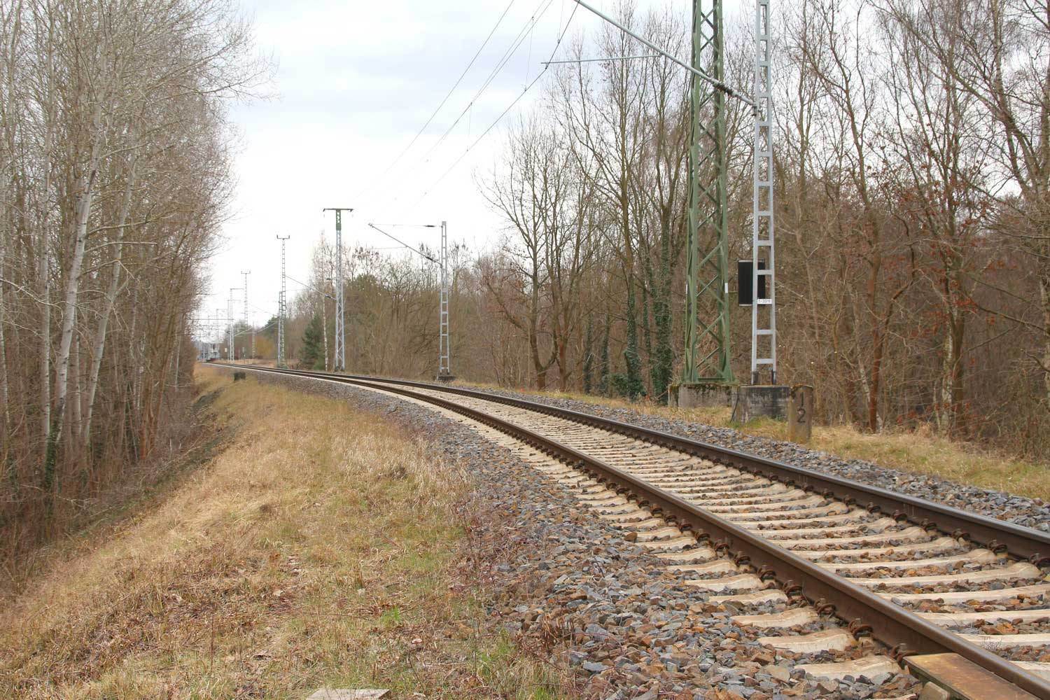 km 11,4 Rechts die beiden Gleise der Görlitzer Bahn (6142) mit km