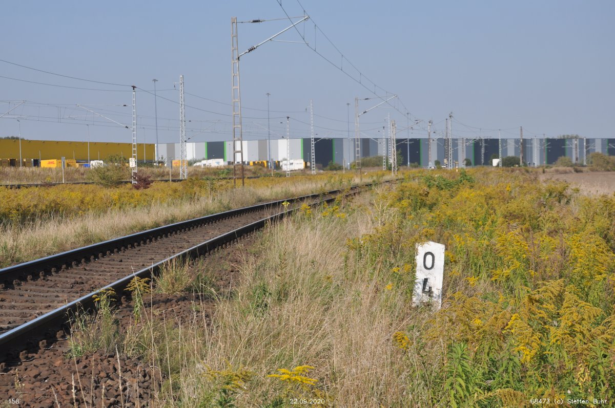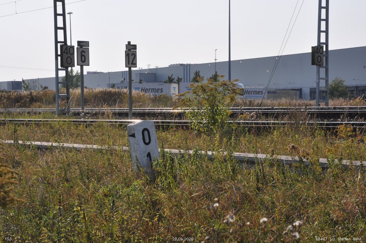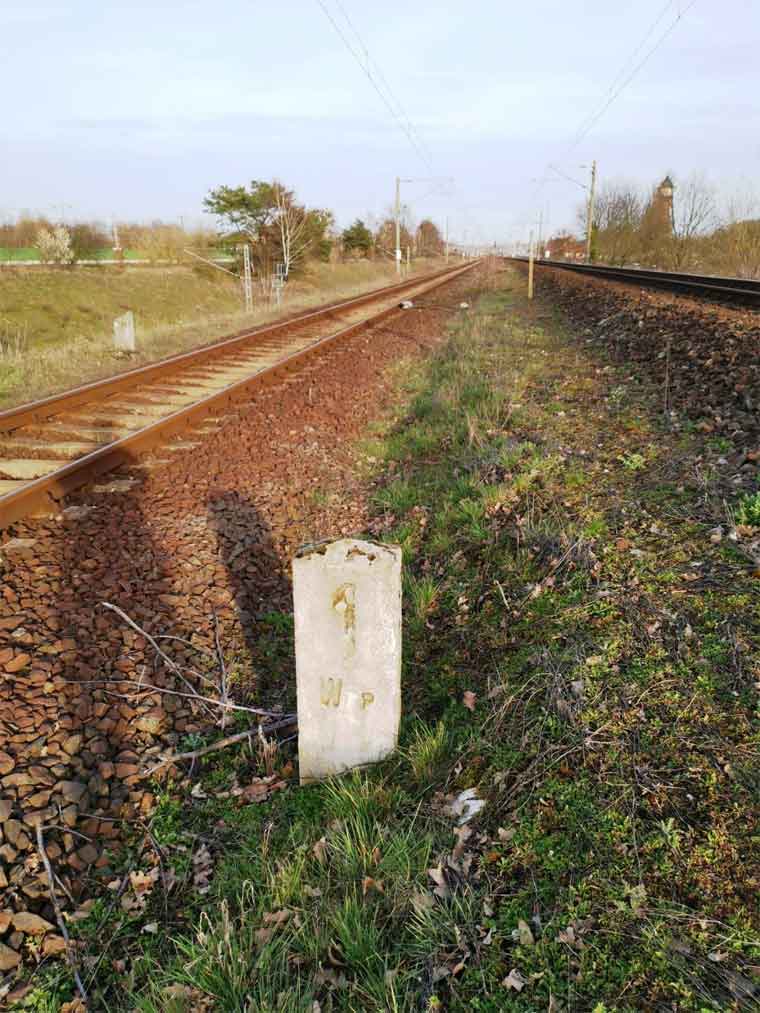 km 1,7 (liegender Stein) in Wustermark Rbf km 2,2 gehört zur Strecke Priort, W 71, km -0,21 - Wustermark Rbf, W 228, km 2,414 (6104) [früher: Abzw