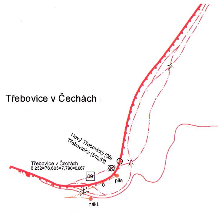 6,232 | km 76,605 der Strecke Prostějov hlavní nádraží (Proßnitz Hbf) 0,0 - Chornice (Kornitz) 40,519 - Třebovice v Čechách (Triebitz) 76,605 |
