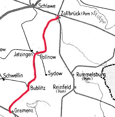 km 40,2 der Strecke Schlawe Kleinbf 0,0 - Jatzingen 34,9 - Pollnow 40,2 (Schlawer Bahnen) Spurweite 750 mm/ab 1934 Normalspur (Dreischienengleis zwischen Jatzingen und Pollnow) | ||
