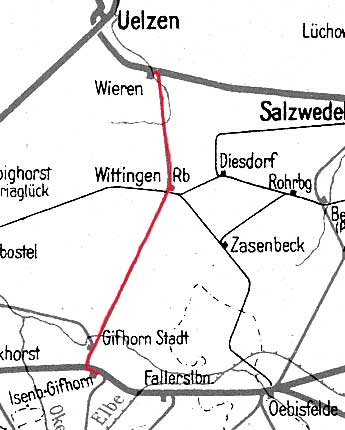 Wittingen Reichsb. | 35,07 | km 52,1 der Strecke (Celle Nord 0,0) - Celle Vorstadt 2,0 - Beedenbostel 16,0 - Wittingen West 52,1 [Osthannoverschen Eisenbahnen (OHE)] |