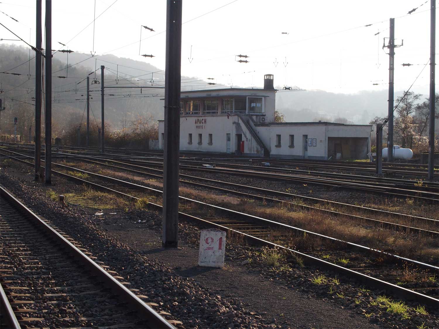 | km 0,0 der Strecke Thionville 0,0 - Staatsgrenze Frankreich/Deutschland 55,159 - Ueberherrn 56,25 - Völklingen 70,25 | ||