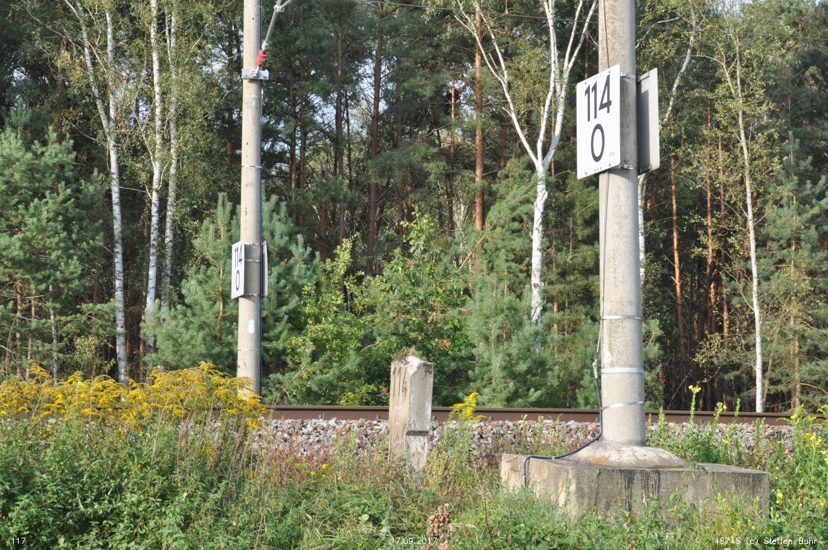 km 100,3 (Stein) und km 100,4 (Tafel) zwischen Ruhland und Lauchhammer Süd