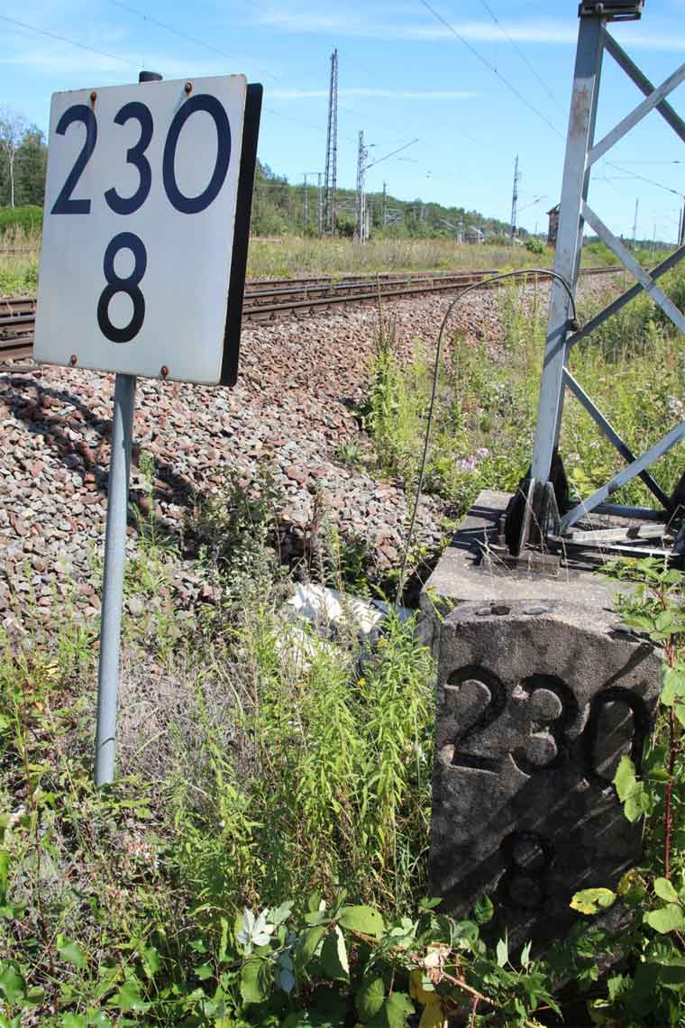 km 230,8 (Tafel) und km 230,9 (Stein) in Roßlau-Meinsdorf - Blick Richtung Węgliniec (Kohlfurt)