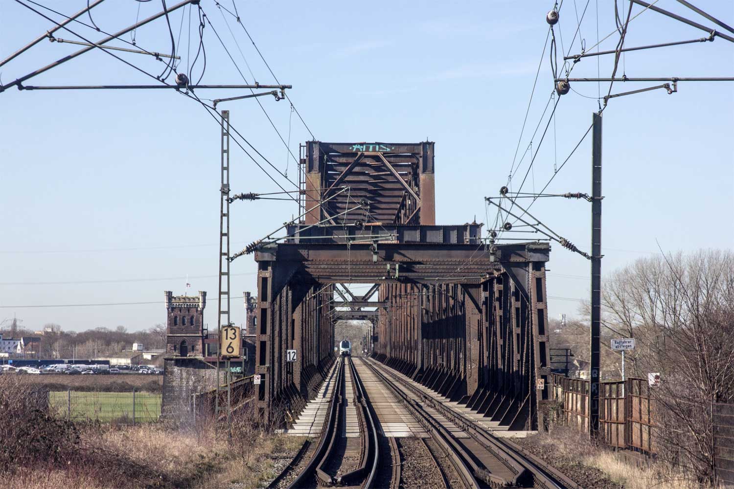 Rheinhausen 10,22 km 0,0 der Strecke Rheinhausen 0,0 - Moers 9,39 - Menzelen West (hoch) 29,37 - Kleve Weiche 4 62,78 - (Kleve 63,69)
