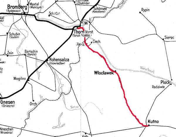 Kutno 0,0 - Leslau (Włocławek) 54,807 - Weichselstädt (Aleksandrów Kujawski) 91,101 - Thorn Hbf (Toruń Główny) 109,55 (1943)