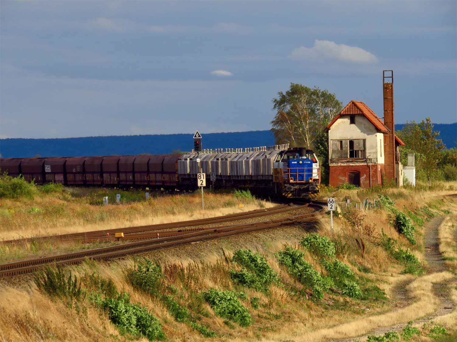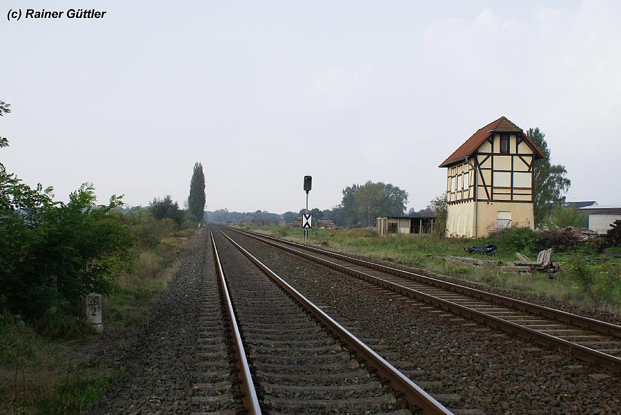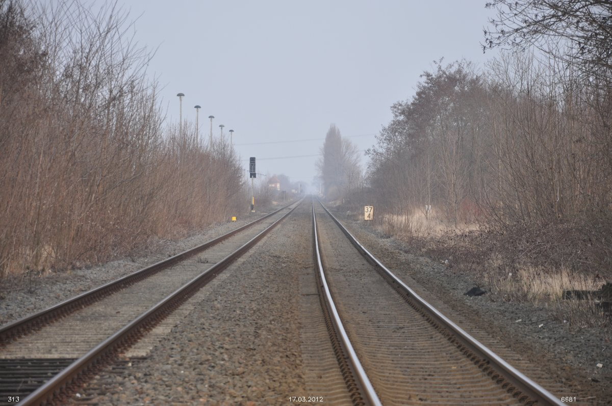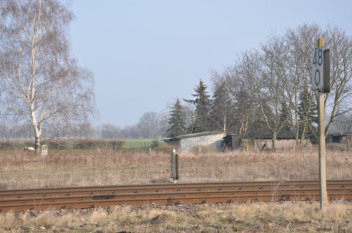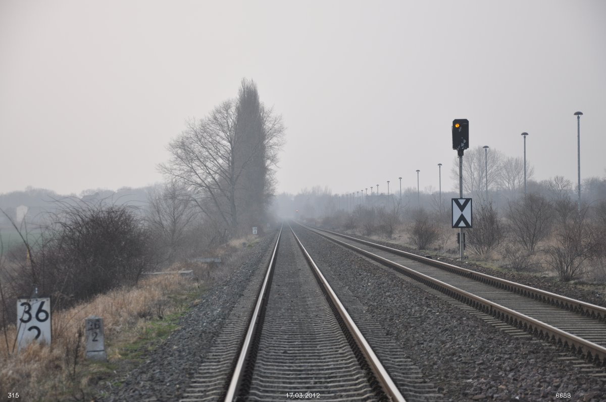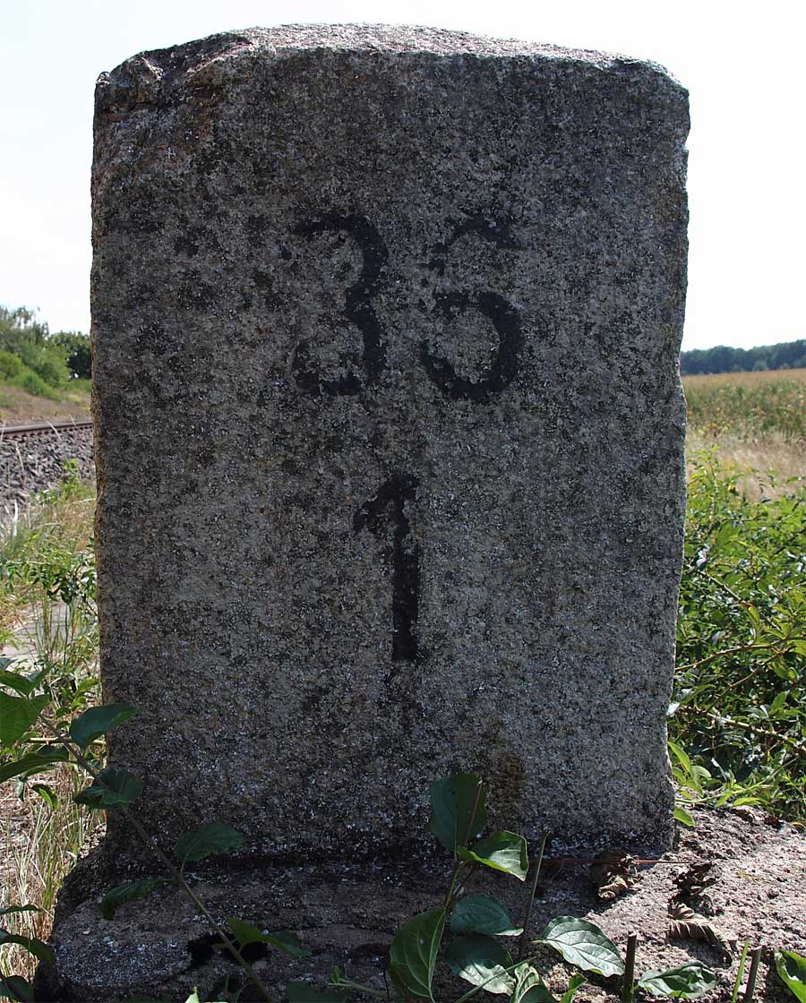 km 36,0 (Tafel) und km 36,1 (Stein) zwischen Hadmersleben und Oschersleben im Bereich des ehemaligen Gbf Oschersleben