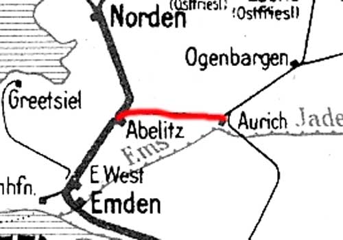 | Abelitz | 0,0 | km 14,78 der Strecke Emden Süd 0,0 - Norden 30,41 (kommend)/ 31,56 (gehend nach Jever) - Asel 76,16 - Landesgrenze Preußen/Oldenburg km 77,90 = km 16,06 - Jever 12,96 - Sande 0,0 |